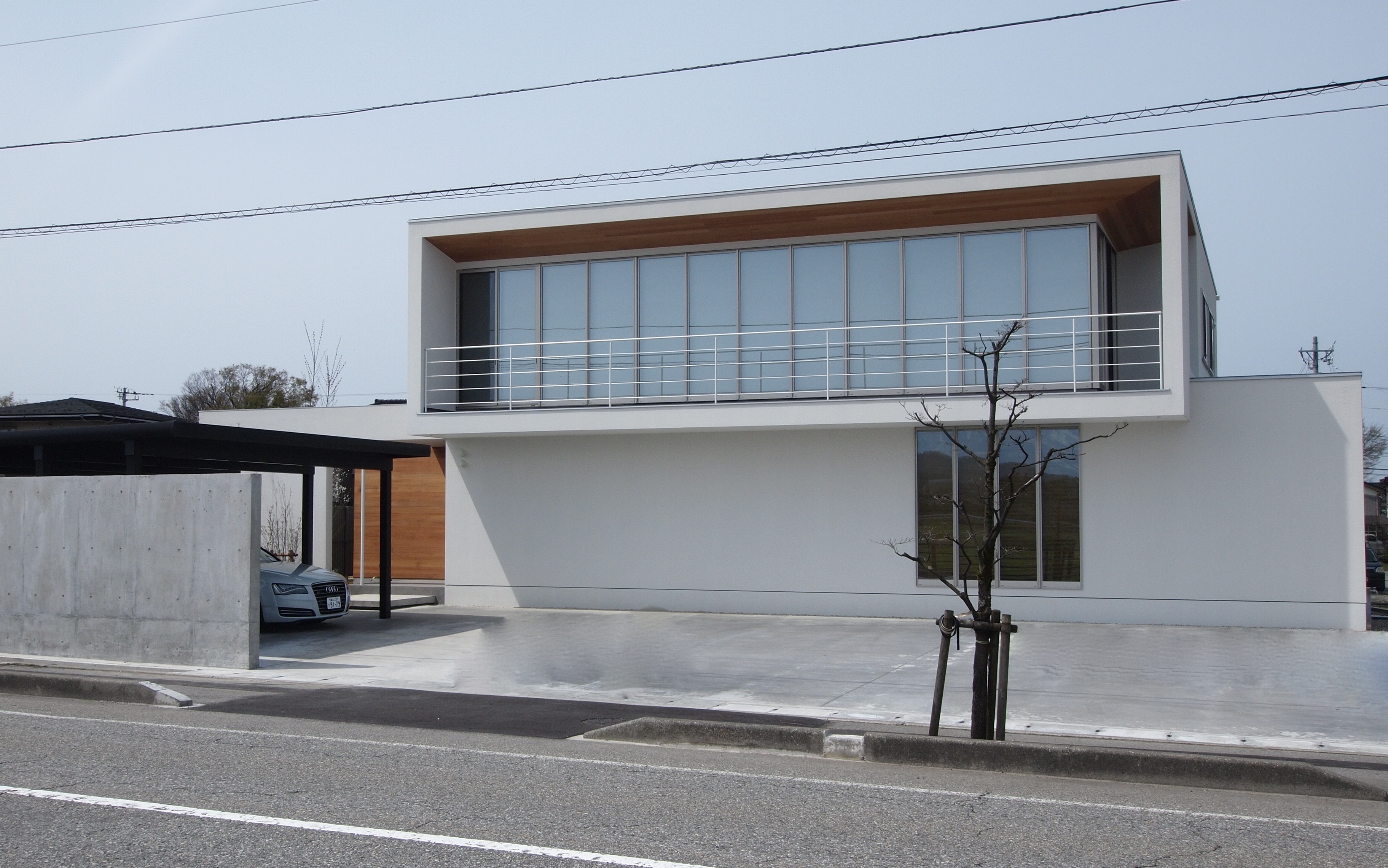 遮るものがない田んぼとその向こうの立山連峰が一体化した家にはどんな空間が必要なんだろう? 敷地前面には交通量の多い幅の広い主要道が走っています。他者の視線も飛び交うこの1階では落ち着いて室内と風景とが一体化することは難しい。それならと、今回は2階にテラスのように全面開放された空間をつくる、できれば床からの開口でありたい、ということでバルコニーも付けることにしました。