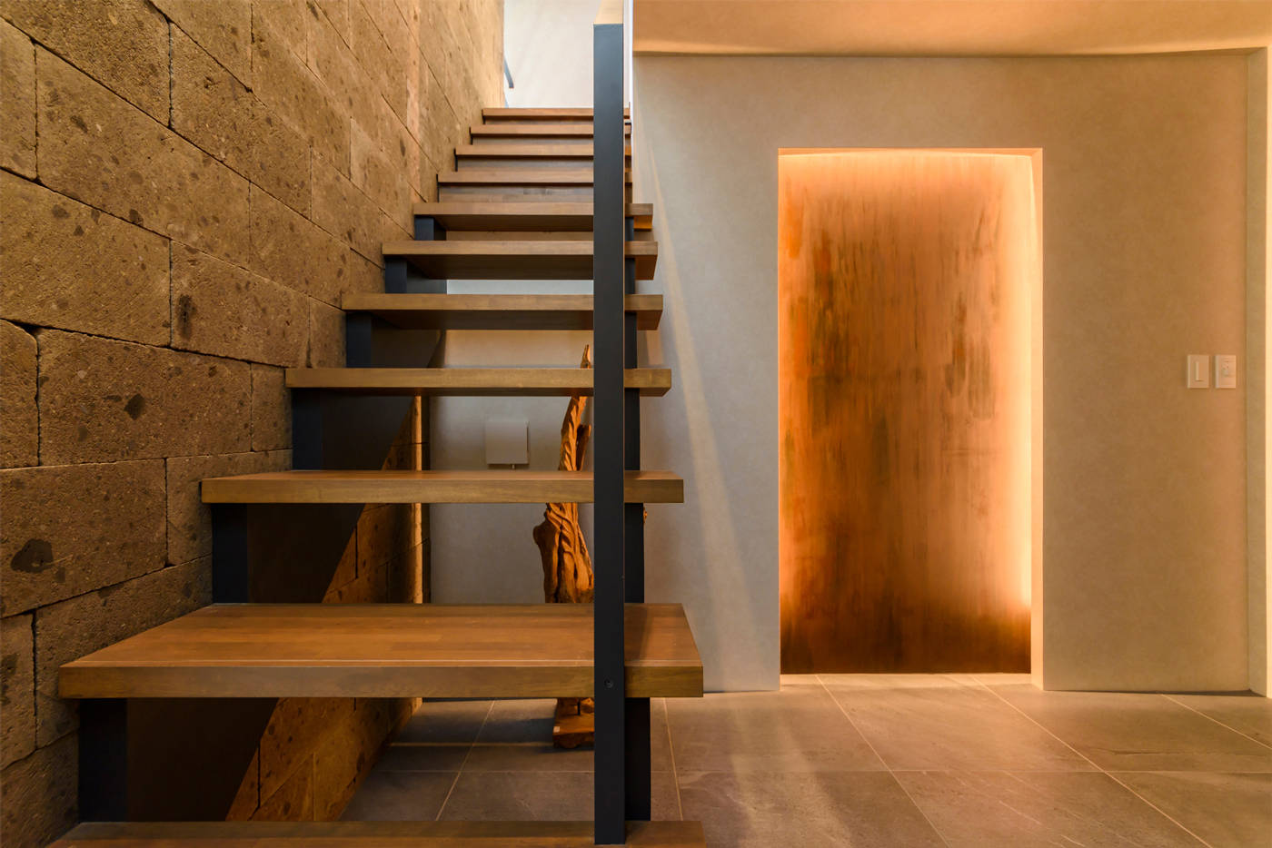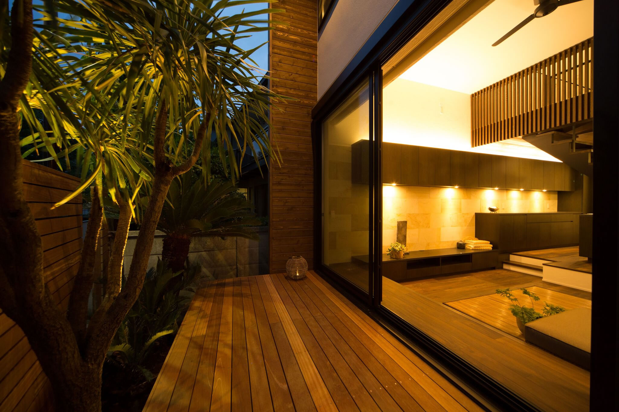 敷地北側からは西側隣地越しに谷戸の前公園の桜並木を享受できるため、LDKを北側に配置し西面に1.5層分の大きな開口を設けた。東面ポーチ側も開口として東西に広がりのある開放感と光に満ちた空間とした。リビング上の2階主寝室インナーバルコニーからは桜並木越しに富士山が望むことができる。