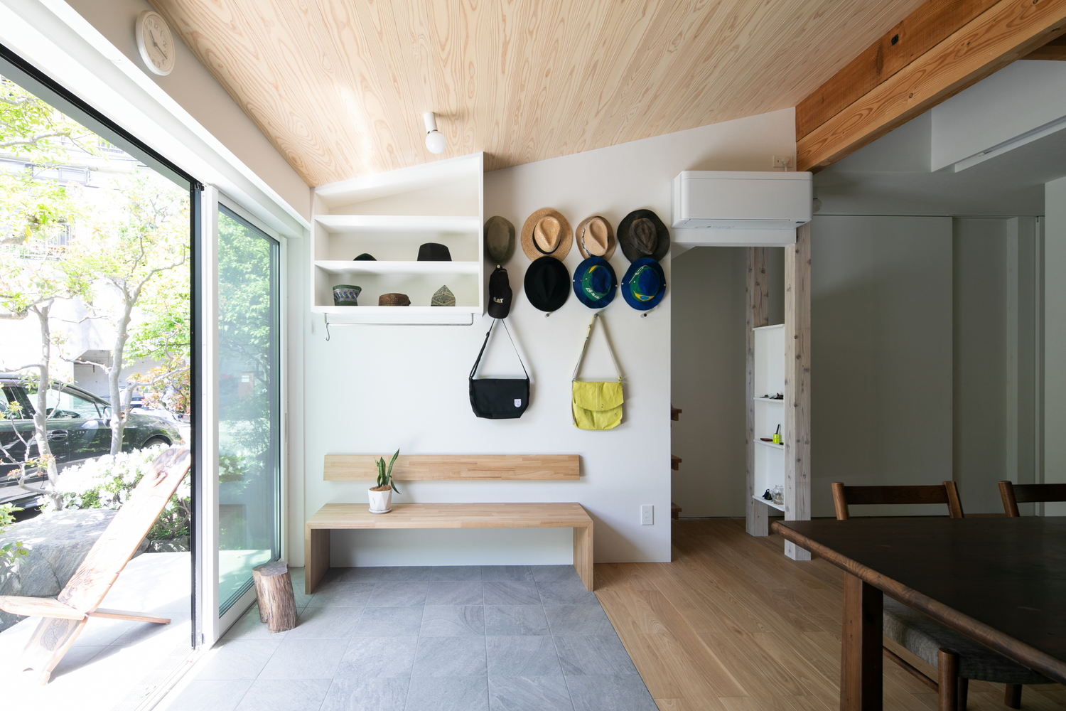 新しさと古さが調和した空間を目指した。自然光を採り入れたキッチンを中心とした回遊性のある空間を計画。暗い所に光を入れる為、吹抜ハイサイドライトを設けた。玄関は昔の記憶として古さを残しつつ調和するようにした。テラスと土間を設置し古い外観を和モダンに。又、外と内の繋がり、もう一つの出入口として暮し方の幅を広げた。 シンプルなスケルトンキッチンを光と暮らしの中心に配置し、白を基調にグレーと木で構成した空間の引締めと抜け感を演出した。