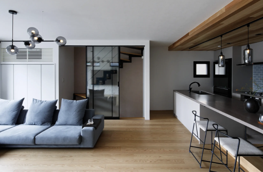 一般的に高断熱住宅では、室内に直射が入ると室温が上昇してしまうため、開口は小さく、内部は暗くなってしまう。しかし、今回は屋外可動式ルーバーを設けることによって、直射を抑制し、大きな開口を設けて、明るい空間を実現している。