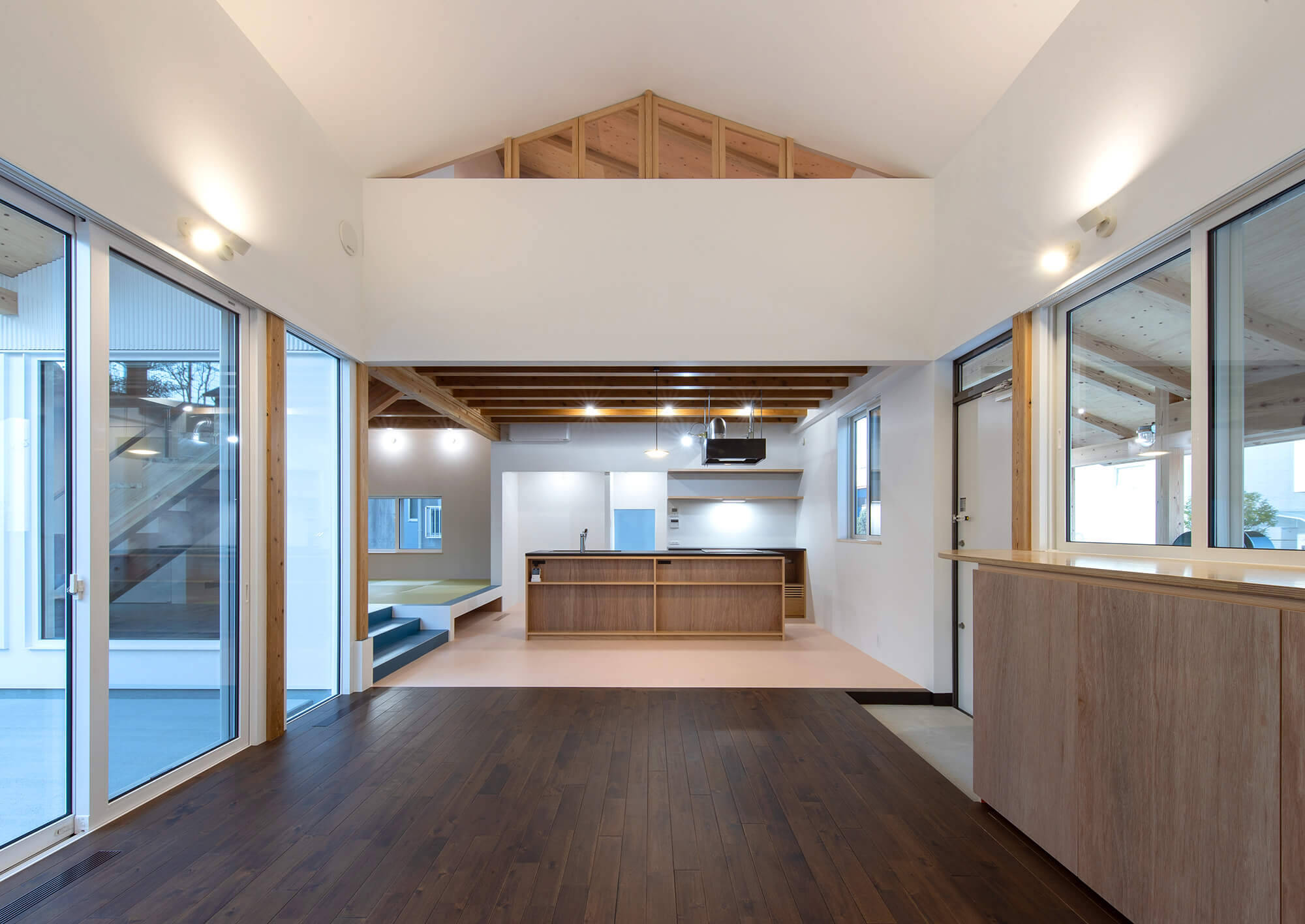 そして、施主様の希望で設けた小上がりの和室は、階段室を和室につながるホールのような場所にすることで、家全体の連続性が途切れることなく、各所に居場所をつくります。