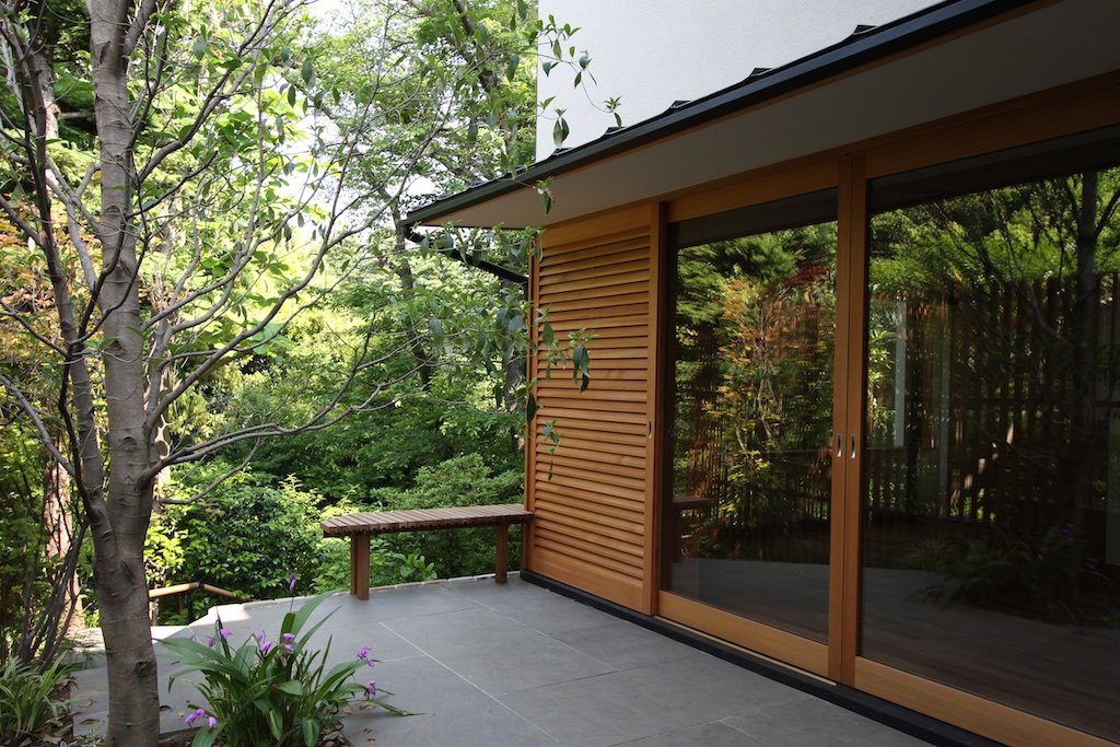 外壁は、レッドシダーの薄い板を重ね合わせるように並べたシングル葺きを採用。レッドシダーの質感が外観に豊かな表情を与え、中庭の景観と調和します。