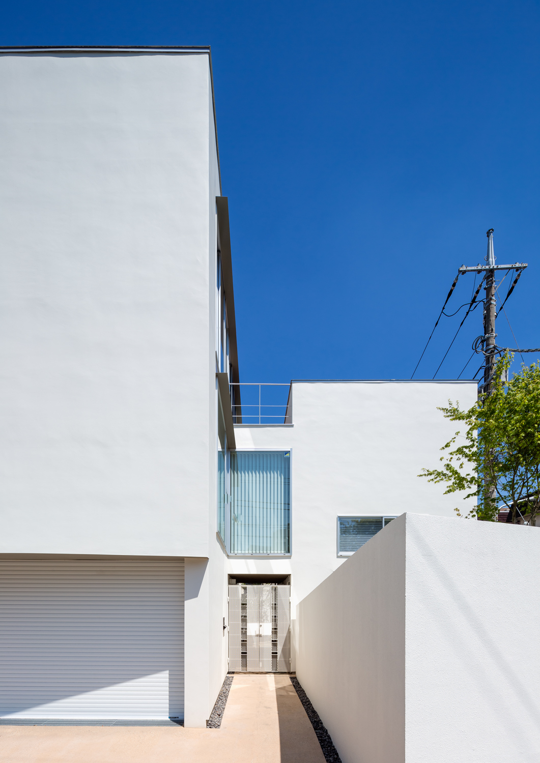 リビングが1階だと車が丸見え、道路からの視線も気になります。それらの問題をクリアにしながら南側の光を取り入れる必要があり、長方形の本体に白い塗り壁で囲まれたパティオがついたプランを思いつきました。吹き抜けのパティオに面した開口から光も風も人も入る「エントランスも兼ねる」ことを思いつきました。