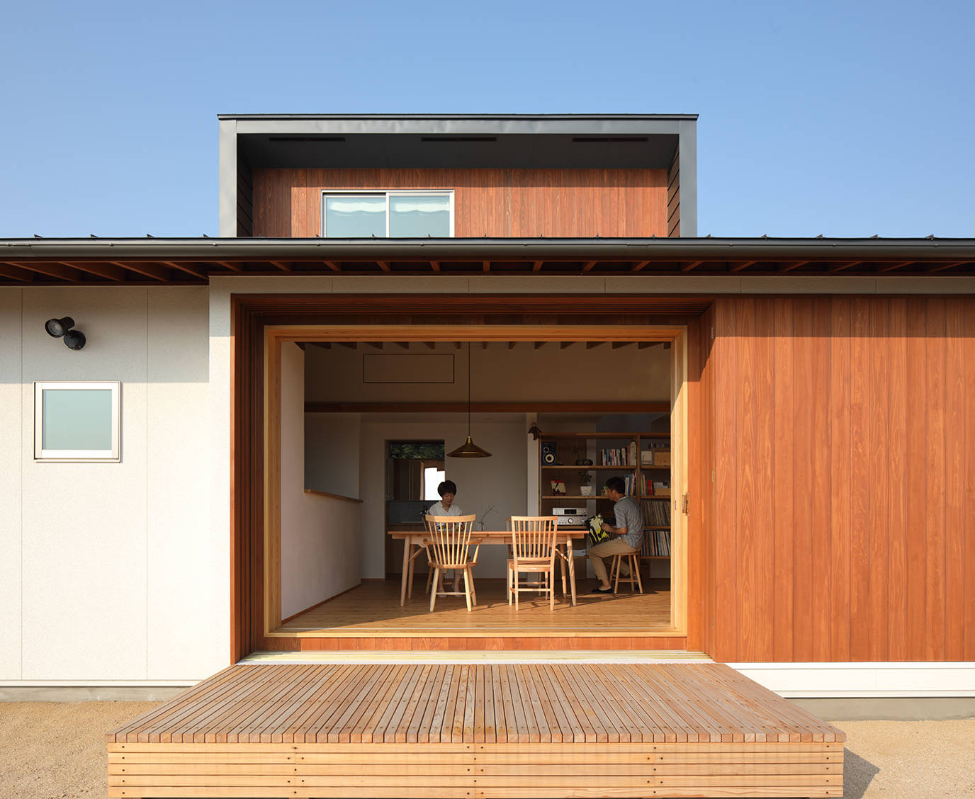 大きな玄関土間、屋内離れの和室があり、基本的な夫婦の生活は1階で完結しており、2階は子ども室とWCがチョコンと載っています。広間の大窓は建主さんのご要望でもあるフルオープンできる木製建具。雨戸、網戸、ガラス戸、障子が仕込まれており、季節や時間に応じて開閉することで快適な室内空間を確保することができます。