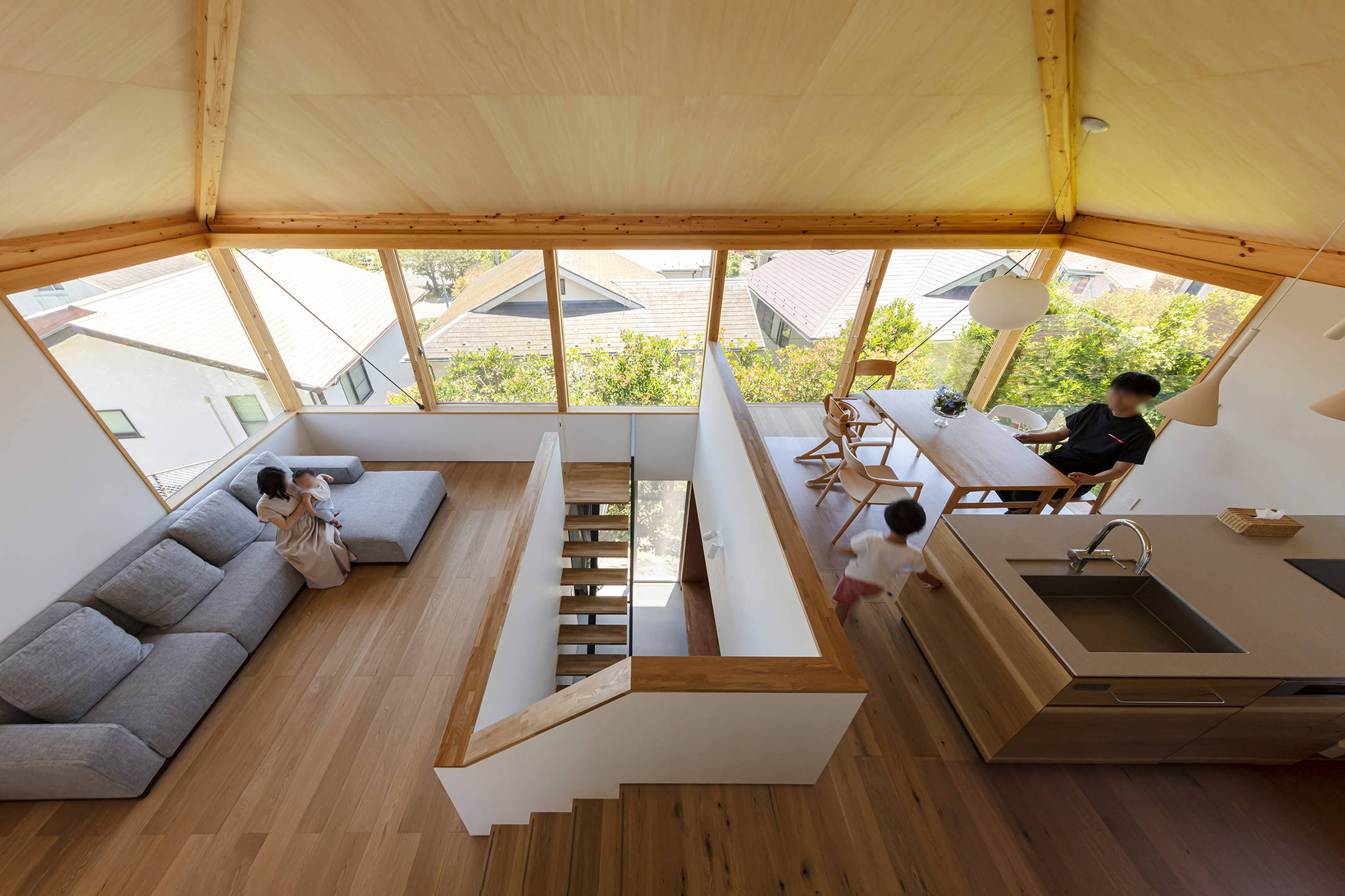 その動きに沿うように2階全体を支持する変形型の方形屋根を架け、1階から続く大らかなワンルームを構成しました。