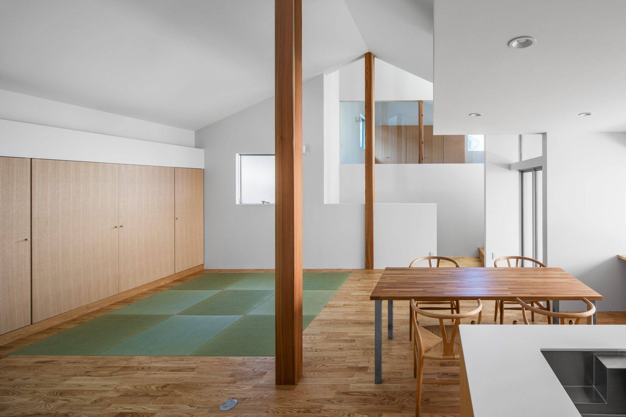 また、適所に設けた窓は南北に長いこの住宅に効果的に光をもたらし、西日で赤く染まる山々やたなびく雲など、その時々によって絶えず変化していく自然を感じ取ることも出来ます。