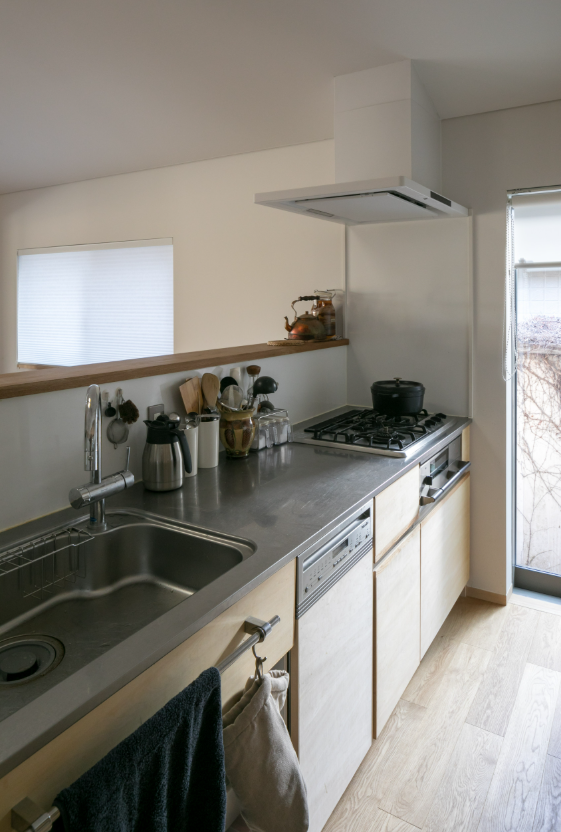 キッチンの扉はシナベニヤ仕上げ、造作家具や内部建具の仕上げと合わせて統一しています。