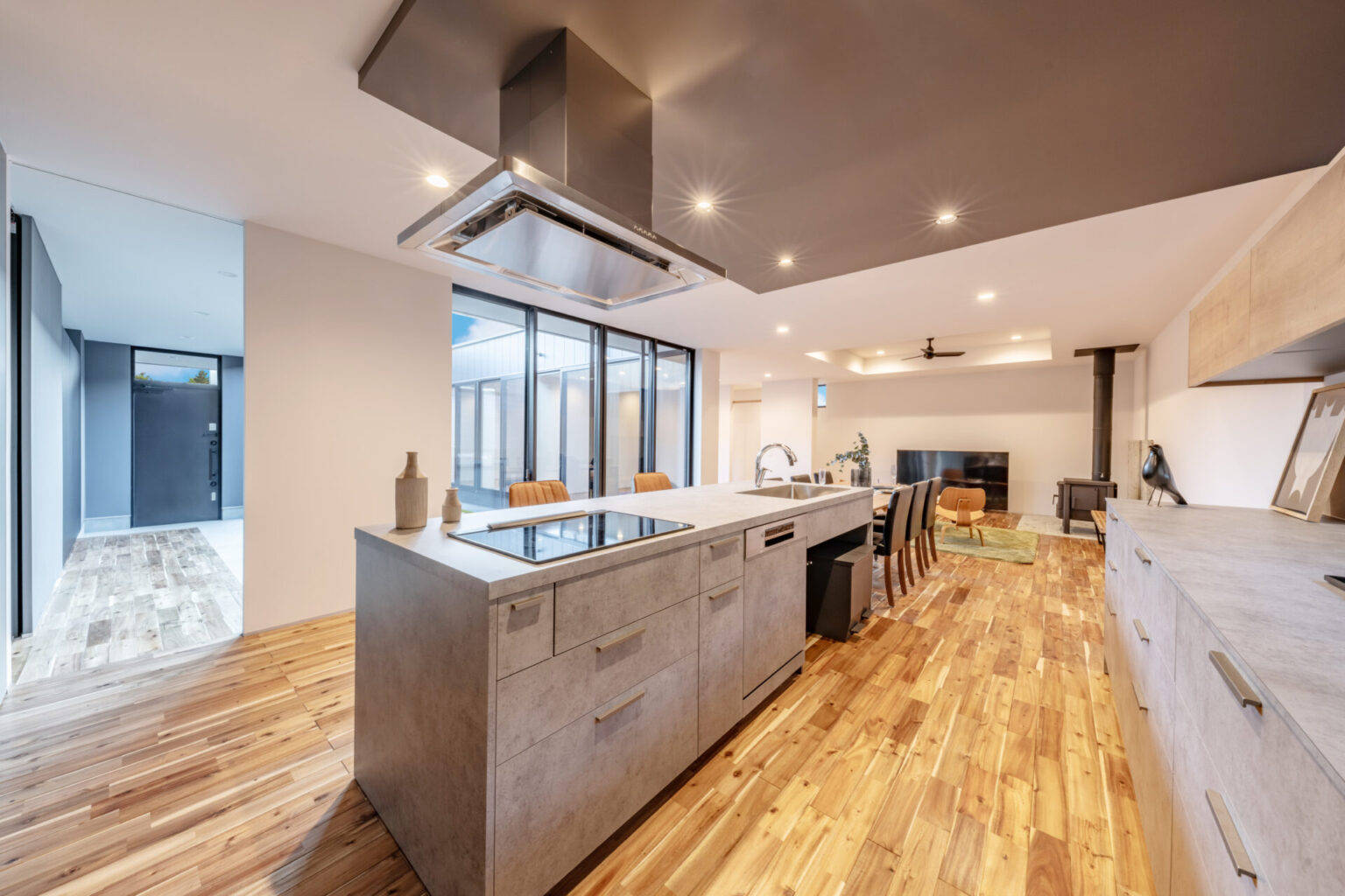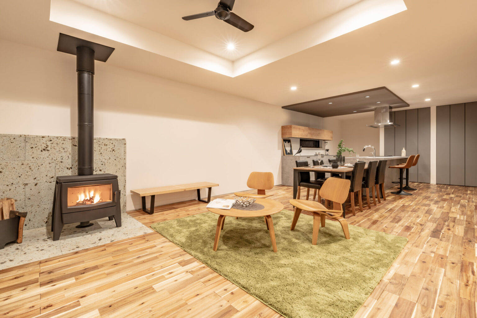 その一角に佇むのは、こだわりの薪ストーブ。炎のゆらめきと薪の爆せる音は心に癒しを届け、LDK空間に集まる家族を心身ともに暖めてくれます。