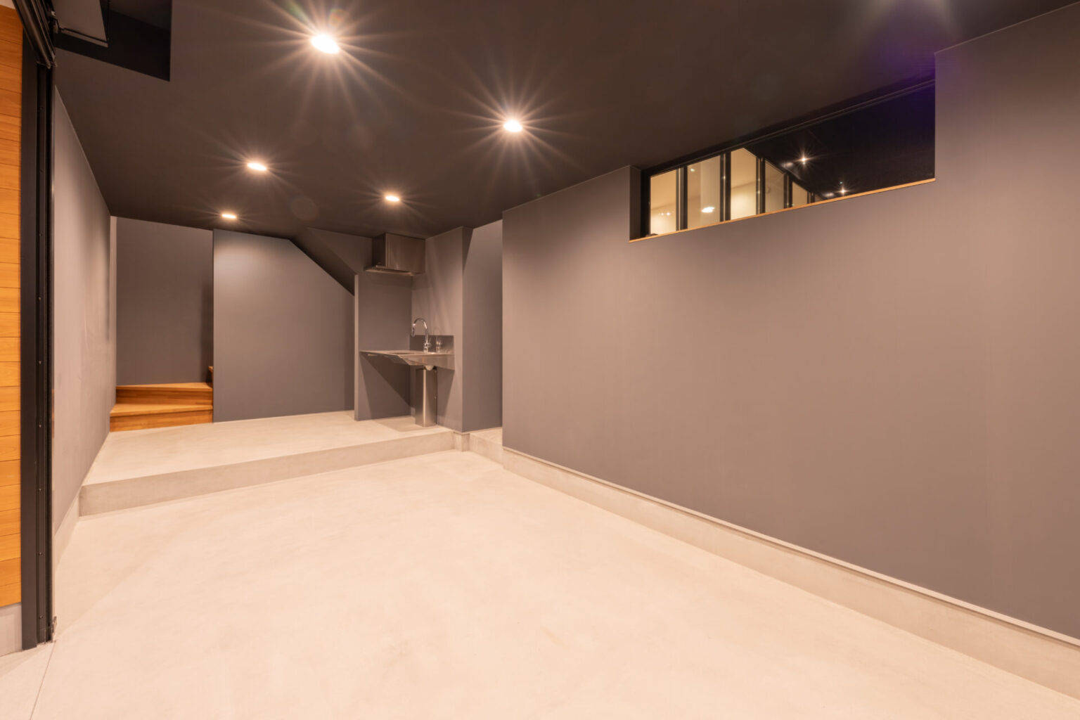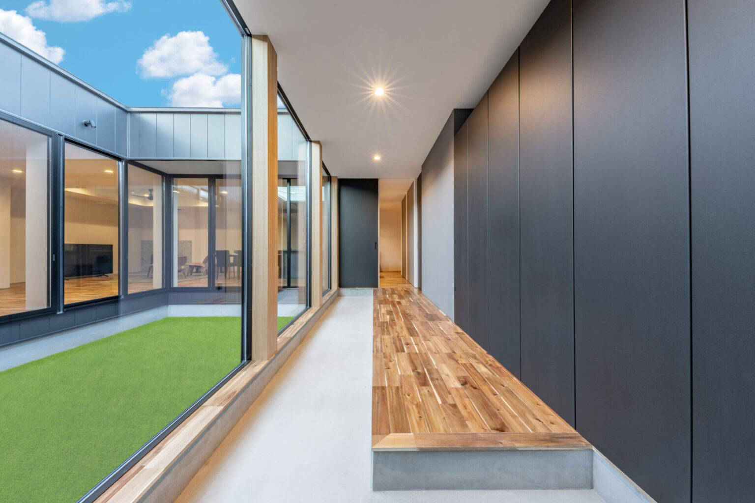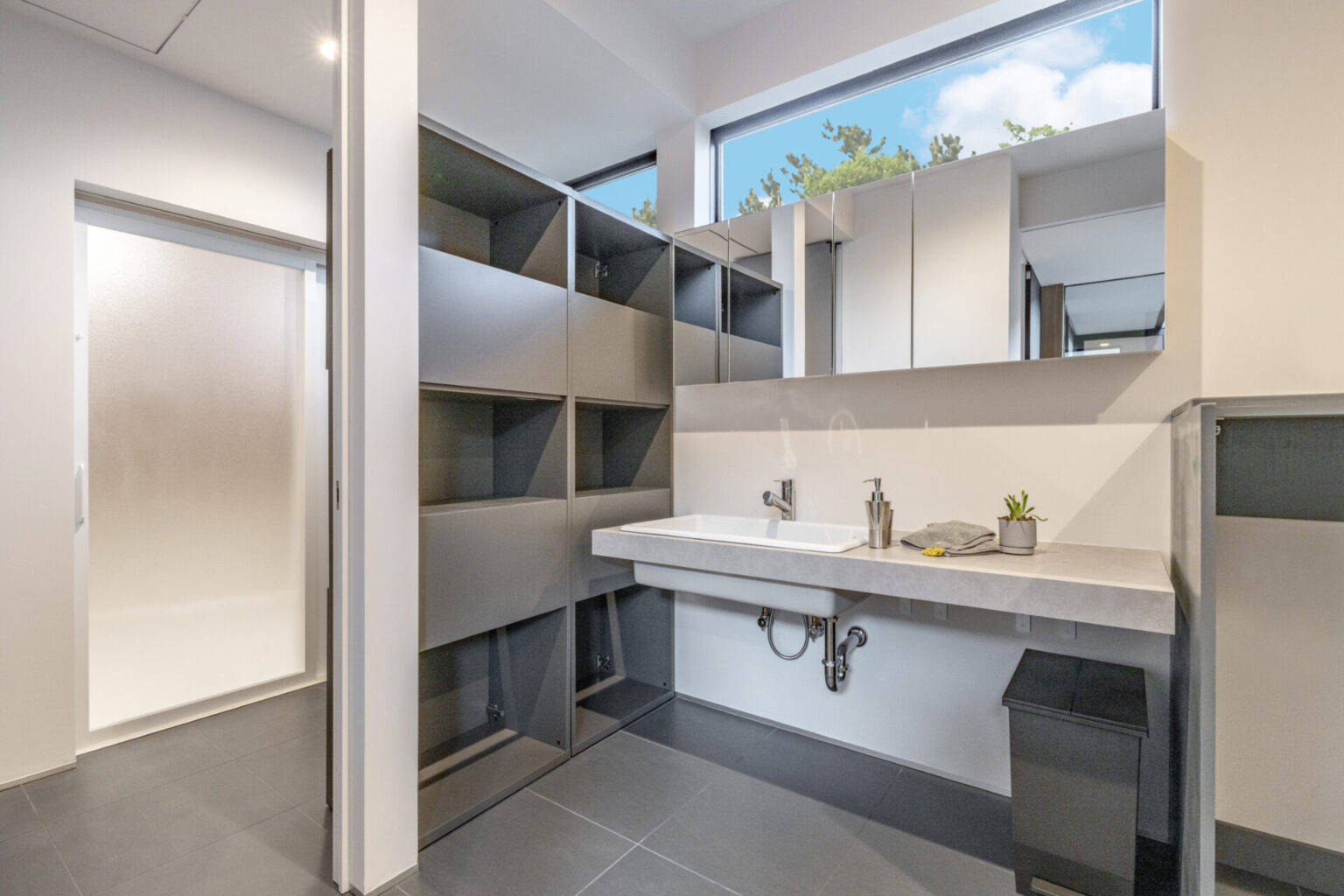 脱衣所に続くランドリールームは、モノトーンのインテリアで、すっきりと落ち着いた印象となりました。個々の空間も大切にしながら、中庭を通して繋がりを感じ、ご家族が健やかにお暮しいただける住宅となっております。