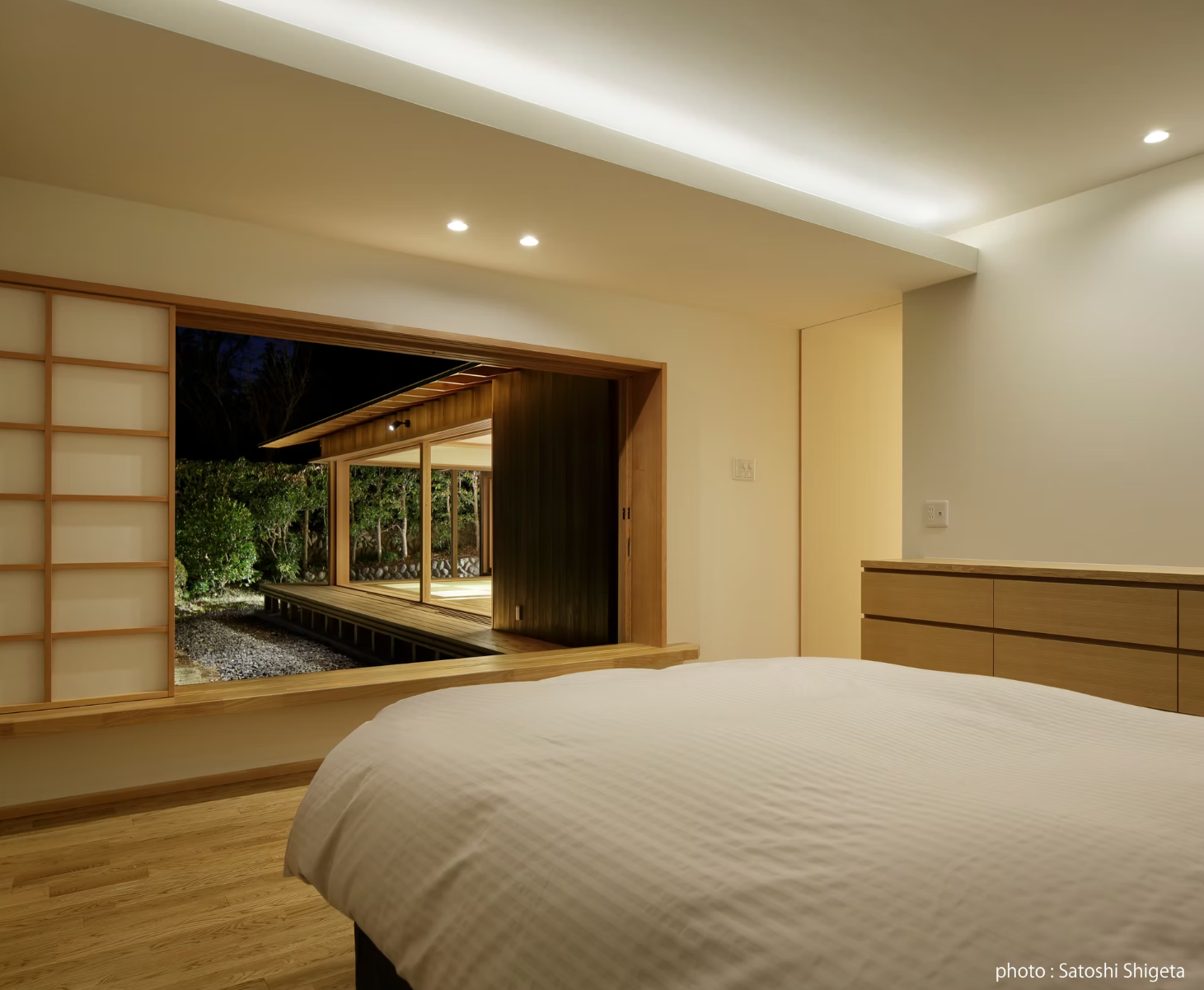 主寝室では腰掛け付きの窓で松と庭を切りとり、ダイニングでは裏山に咲く桜や紅葉が味わうために窓の高さをテーブルに揃えたりと、場所ごとに異なる外部の扱いや見え方の変化が、外部との多様な関係をつくる。