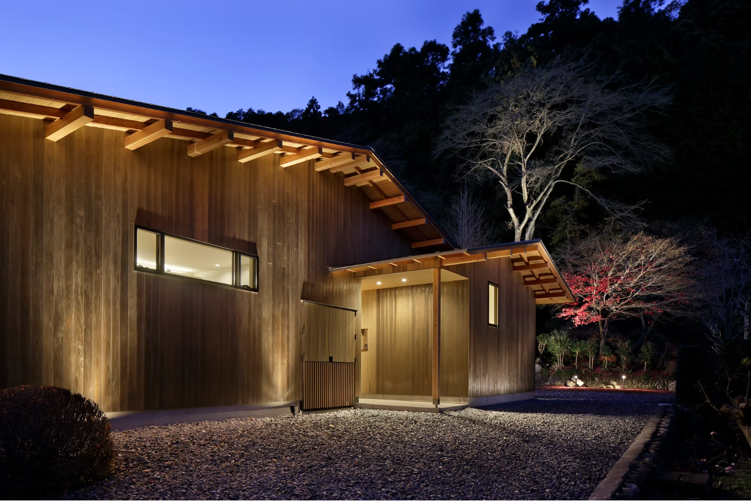 のどかな里山風景と神社への参道に囲まれた住宅の建替え計画。既存の庭と松を活かしたいという要望に対して、雁行配置により建物と庭を市松模様のように描いている。