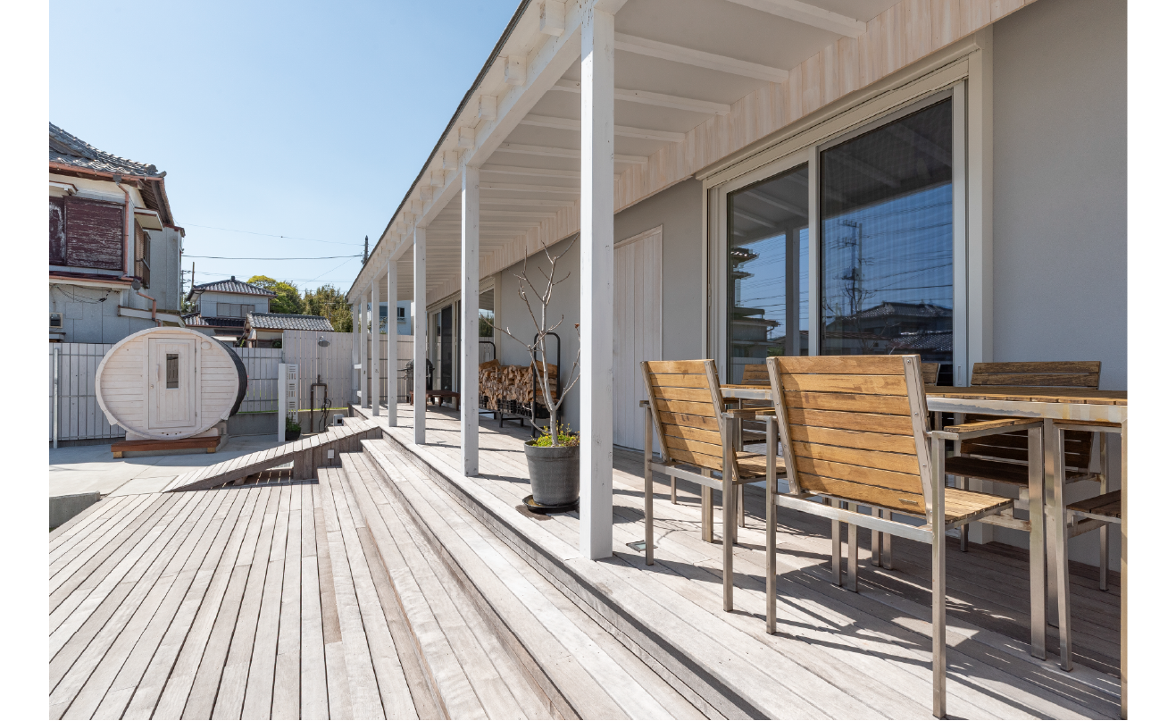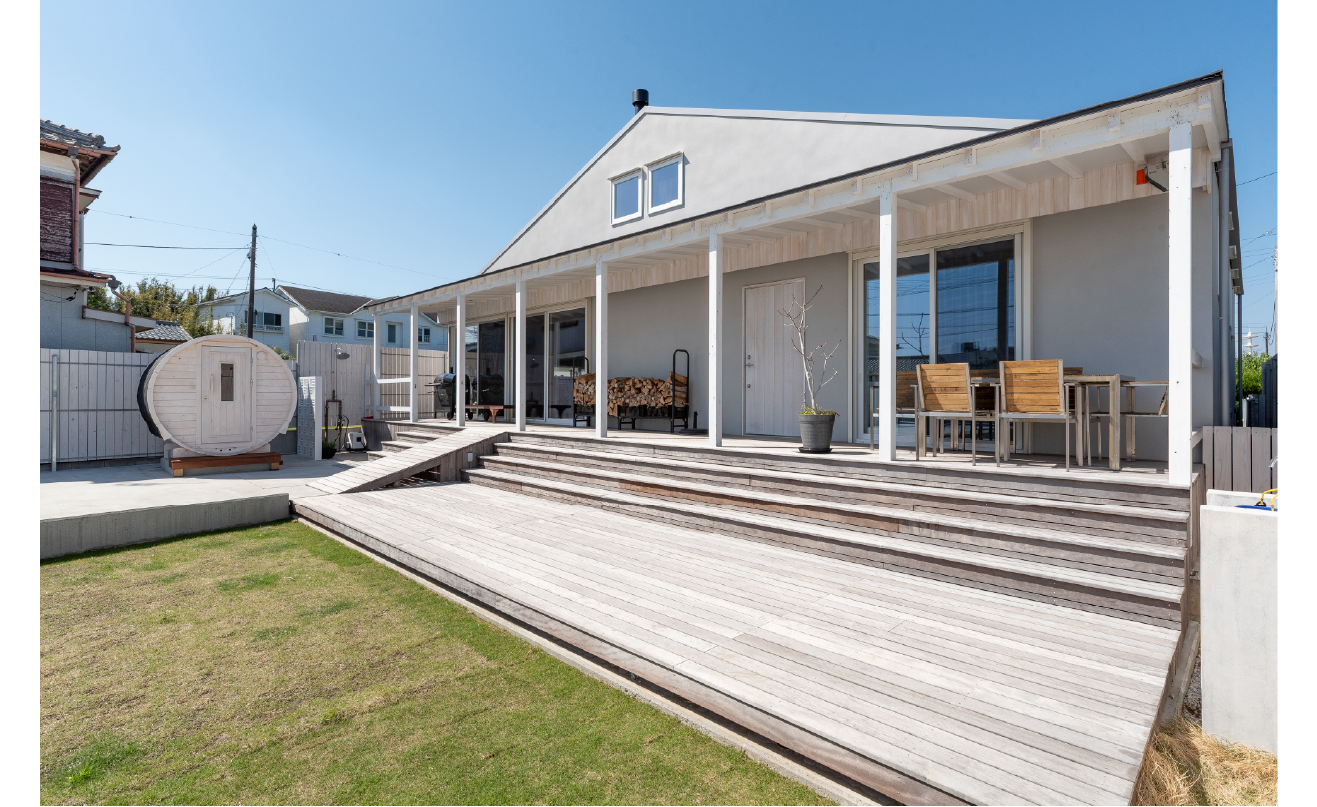 LANAI(ラナイ)は、ハワイで見られる半外部空間・・・リビングと芝生の庭をつなぐデッキ空間として設計され、数匹の犬とサーフィンとバレルサウナ、バーベキューなど家族が1年中楽しめるアクティビティの中心となっている。