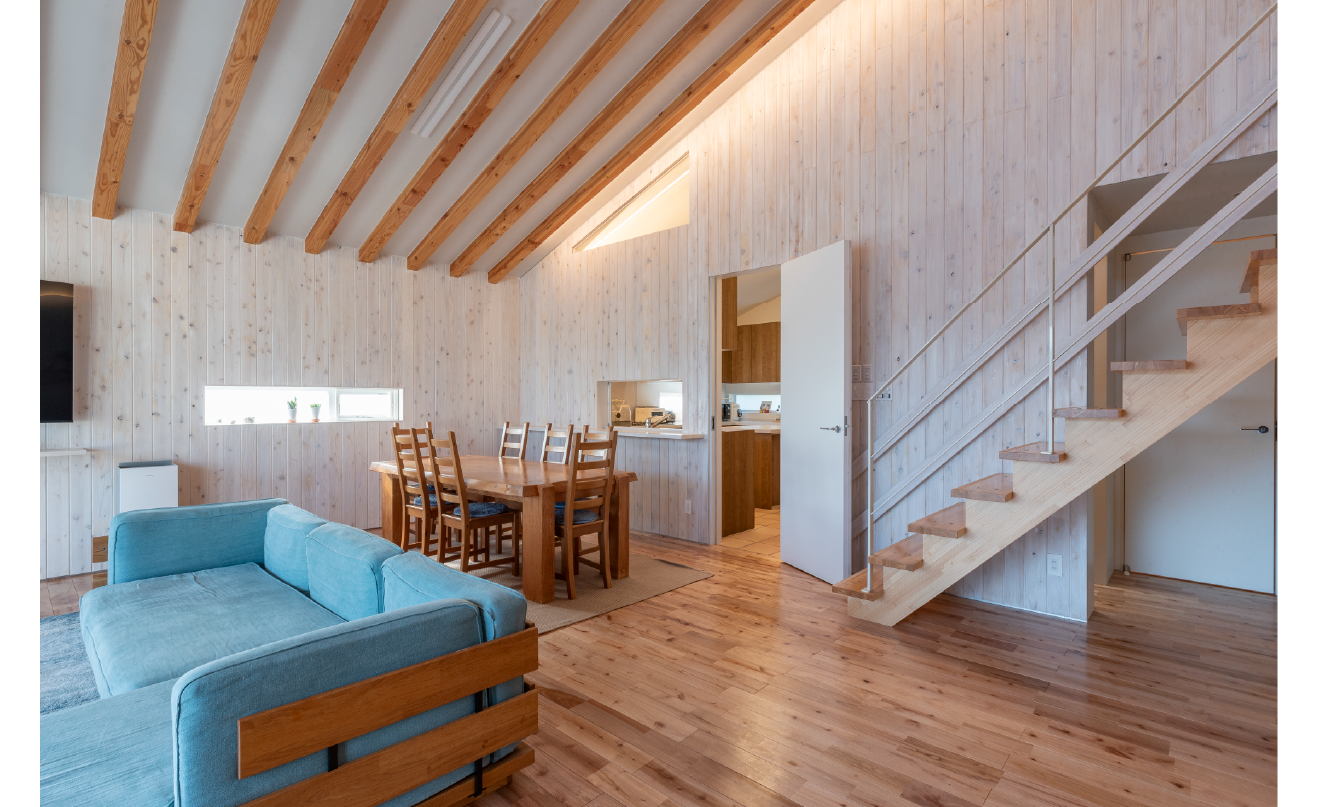 この房総地域は近年とても災害(台風・浸水)が多く、海からの強風を流すために屋根形状をシンプルなゲーブル形状とし、屋根材にはガルテクト(耐塩害性ガルバリウム)、敷地周辺には防風用板壁(防腐塗料オスモ)で囲われ強風から守るデザインを採用している。