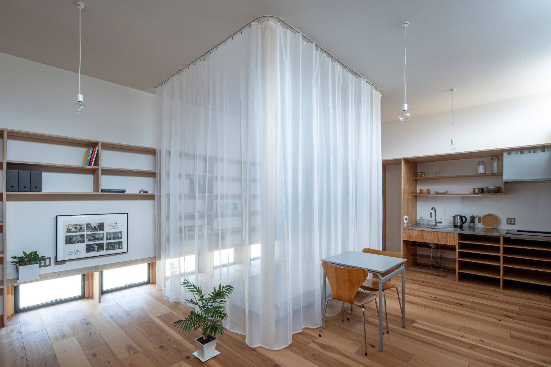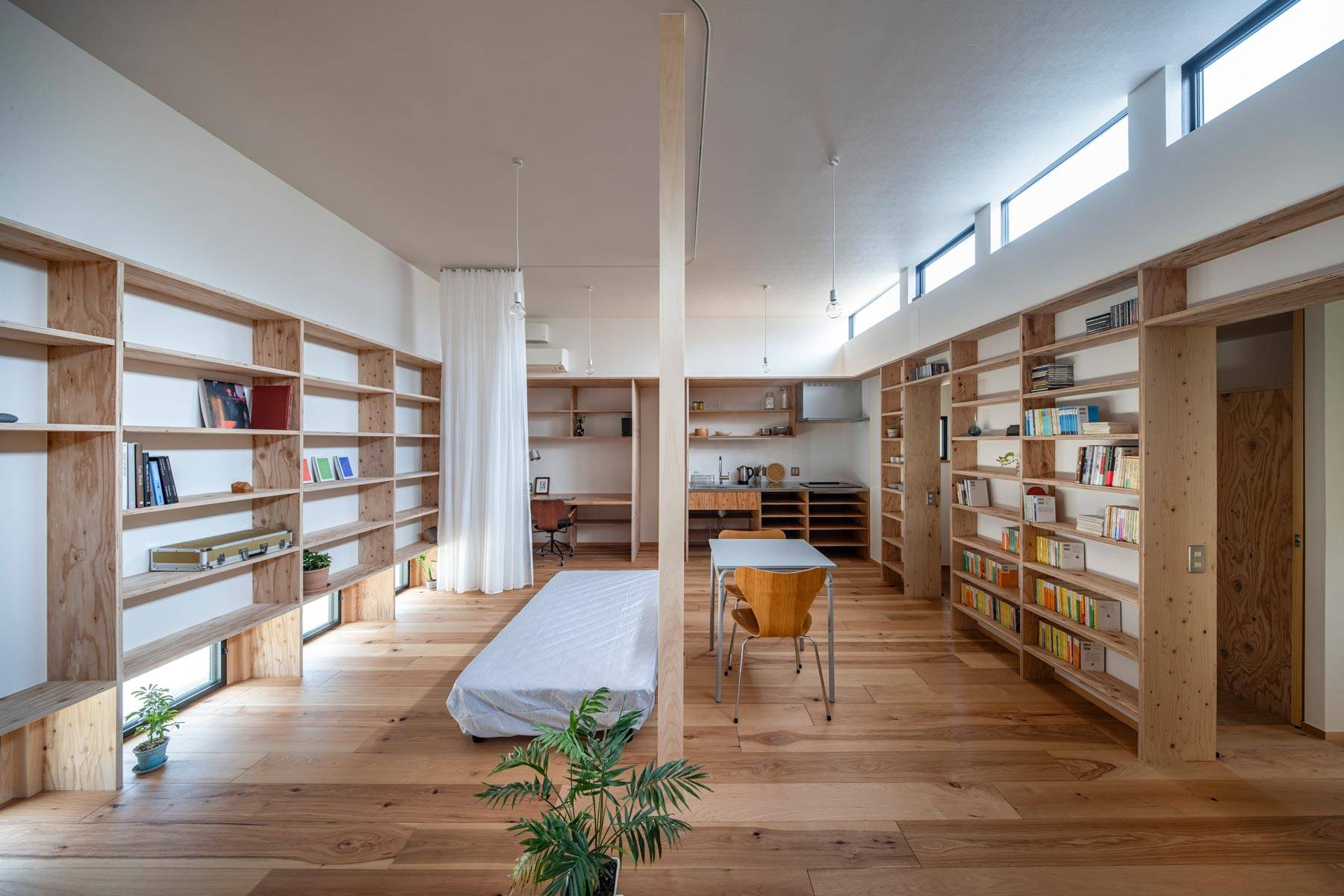 ひとり暮らしの食・寝・働・憩を集約した大きな居間。