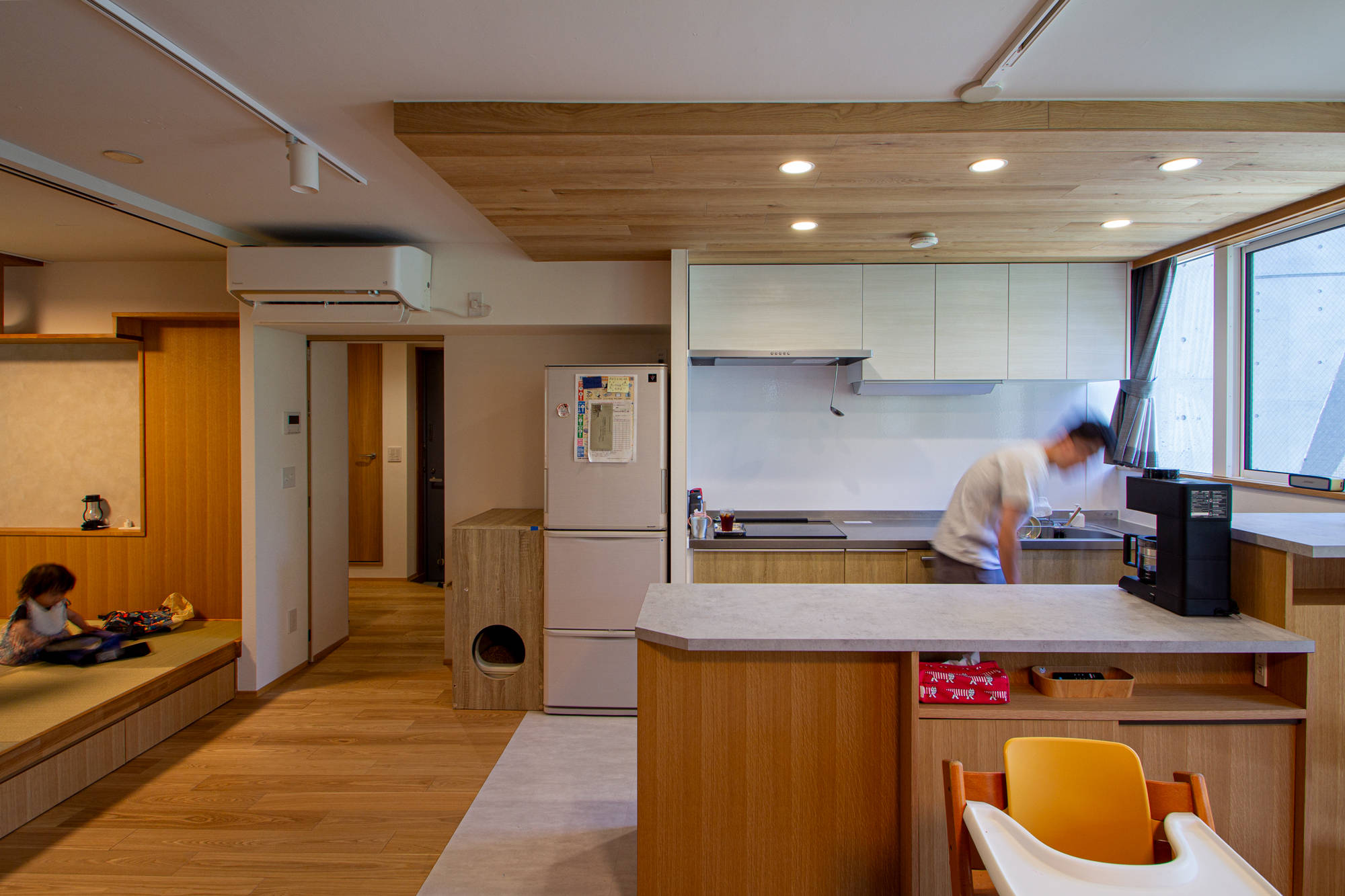 天井高さ2.3mの中に、立体的に居場所を配置し、回遊式で、抜け感のある空間は、面積以上にゆったりと感じられるマンションです。家族のライフスタイルにあった、オンリーワンの間取りにガラッと変わったリノベーションとなりました。
