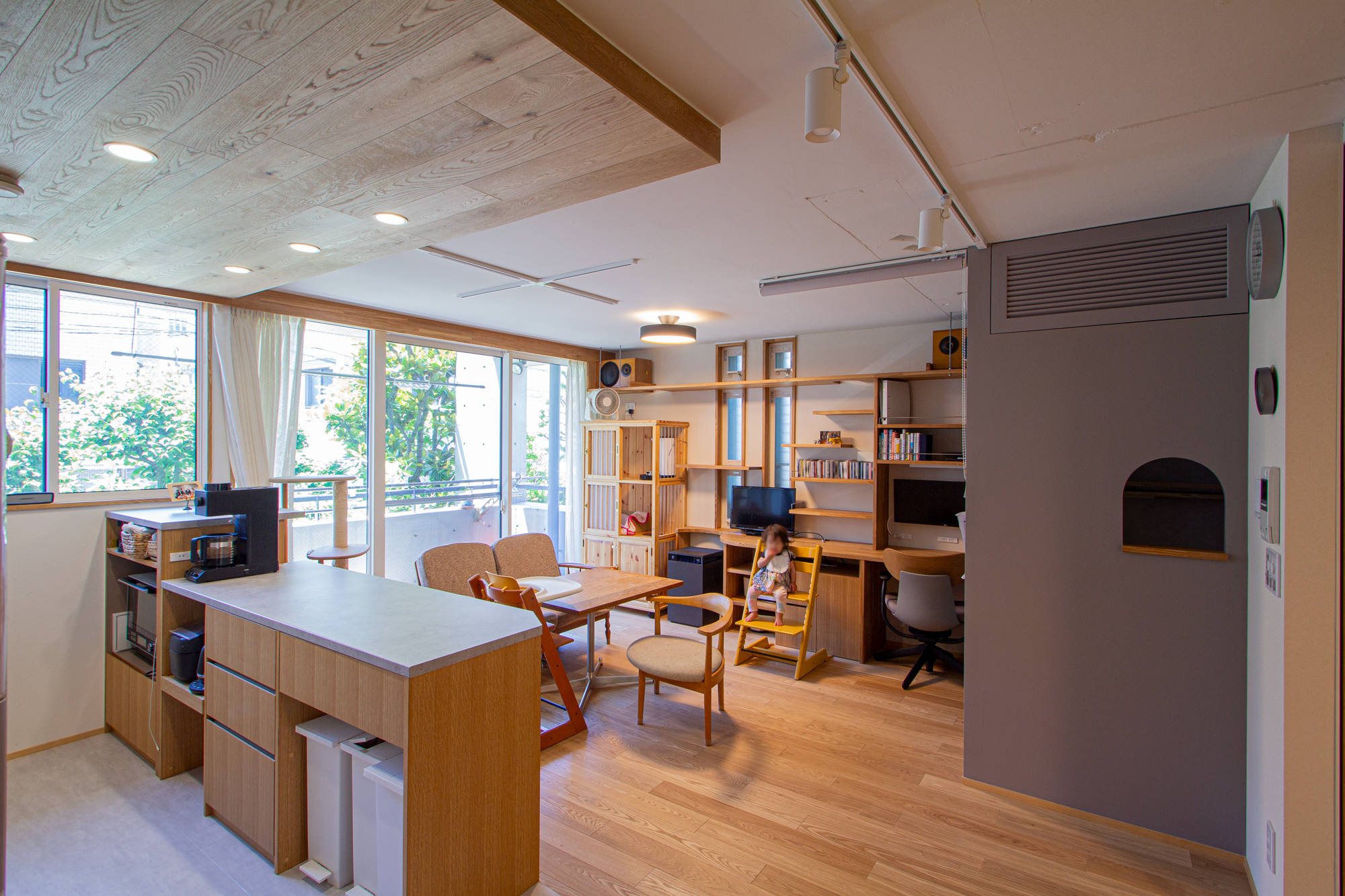 収納量を計算して、収納をつくるなど、論理的に設計する一方、遊び心もあふれた間取りとデザインになっています。グルグルお子さんが走り回れる様、上段ベットのしたにアーチ開口をつくり、子供だけが立って通れる回遊式動線です。そのアーチの横にはお籠もりヌックがチラリと。そこここにある小さなアーチの開口は、抜け感と共に、猫ちゃんの通り道に。一般的な個の部屋が無い家ですが、施主のライフスタイルにあった施主らしいマンションになっています。
