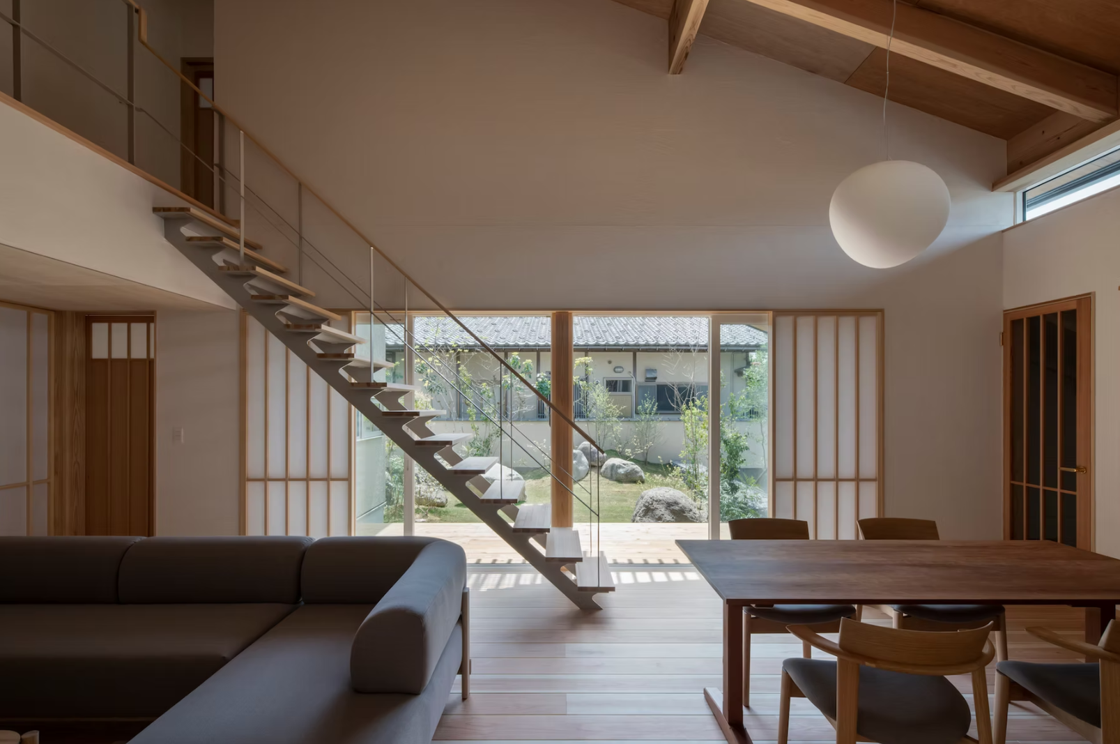ダイニングのペンダント照明はFOSCARINI社のGreggを採用しています。この不整形で柔らかなフォルムは庭に置かれた庭石との連続性を意識しています。これらの庭石はもともと、この敷地内に置かれていたもので、子供たちが敷地を見に来るとよくその石の上で遊んでいるというエピソードから、造園家の山崎 広介さんに子供たちが石に登って遊びたくなるようなお庭を考案してもらいました。