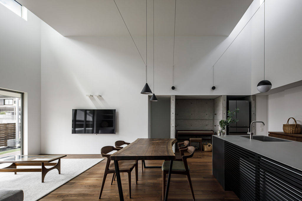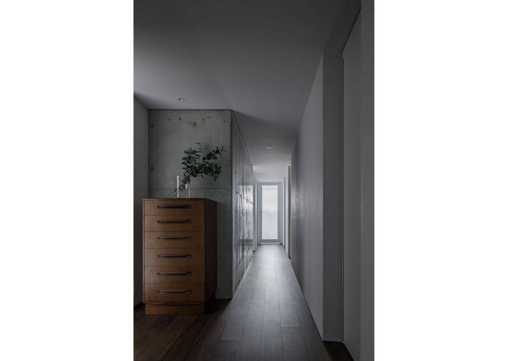 LDKに一部取り入れたコンクリート打ち放しの壁は均質な空間の表情を変えるとともに、外へ流れるピアノの音を軽減します。