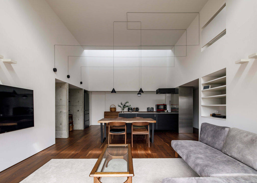 LDKのメイン照明は空間に合わせて自由なレイアウトが可能なMichael Anastassiades (マイケル・アナスタシアデス)デザイン String Lights(ストリングライト)を採用。