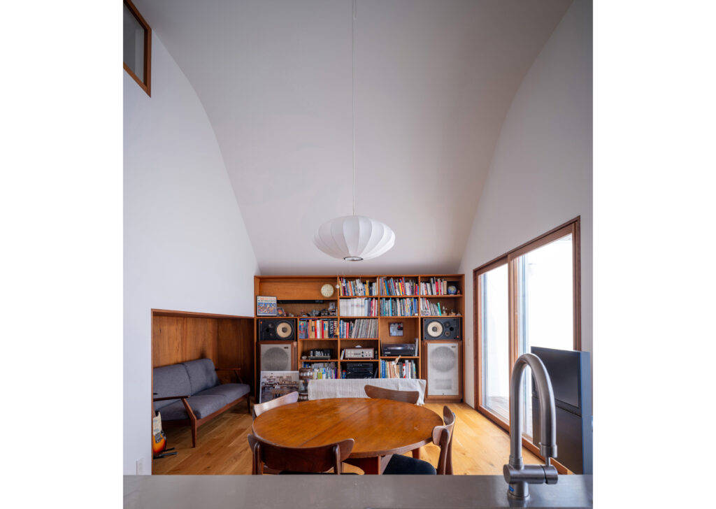 LDKは曲線天井により光をやさしく拡散し、空間に奥行きと落ち着きをもたらします。白を基調にした内装と落ち着いたトーンの床仕上げにより、ヴィンテージの家具や雑貨が自然と調和する背景を整えました。