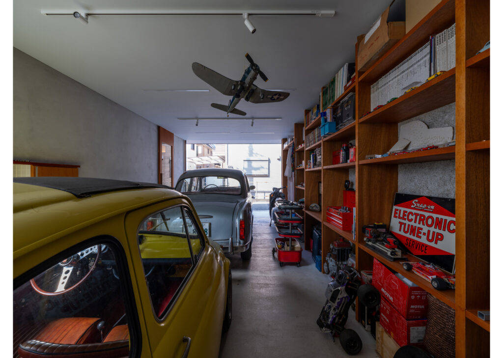愛車フィアット・チェントをはじめ、2台の車と複数のバイクを収容できるガレージには、木毛セメント板やモルタル仕上げの壁を採用。