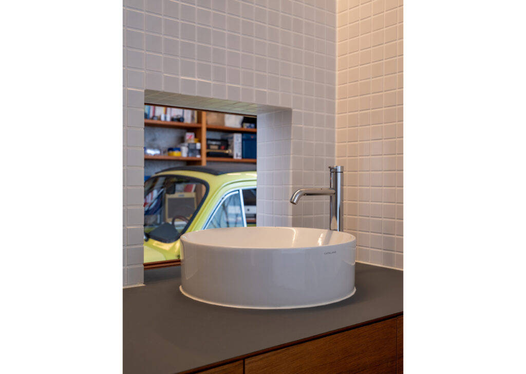 階段室のトップライトから差し込む光と風は、書斎やロフト、ドライルームにまで行き渡り、家全体に心地よい流れをつくります。ガレージに隣接した洗面室には小扉を設け、整備のあとの手洗いもスムーズに行えるよう配慮しました。