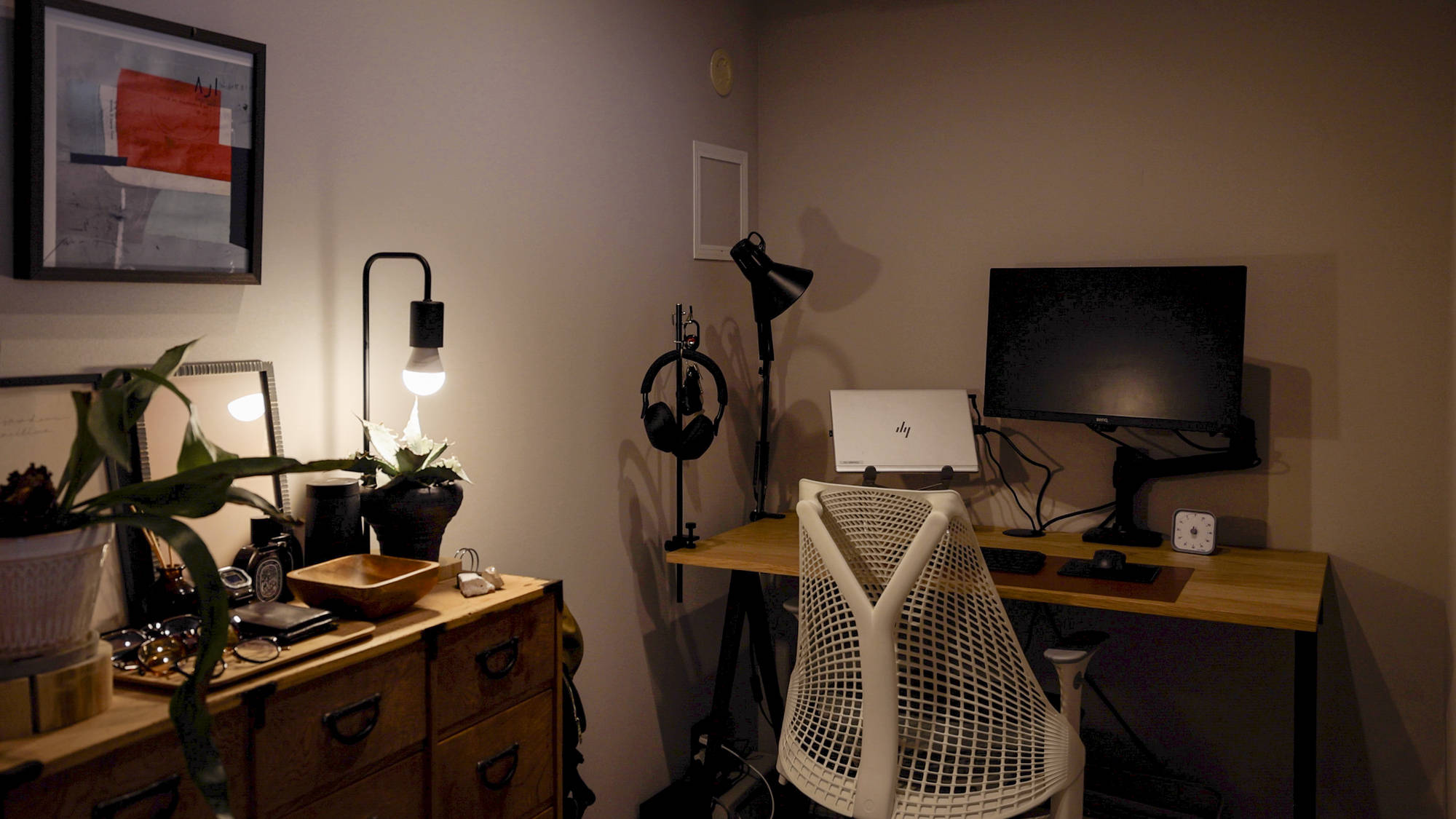 ご主人がリモートワーク中心であることから、リビングの一角には“こもれるワークスペース”を設置。単に仕切るのではなく、リビングの気配を感じつつ空調も取り込めるように室内窓を設けています。