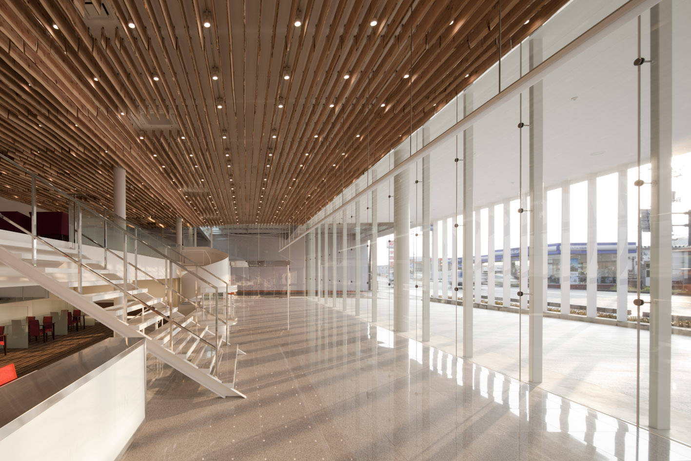トヨタカローラ秋田の南店を設計するにあたって、秋田らしく、温かみのある優しい空間でお客様を包みたいと考えました。