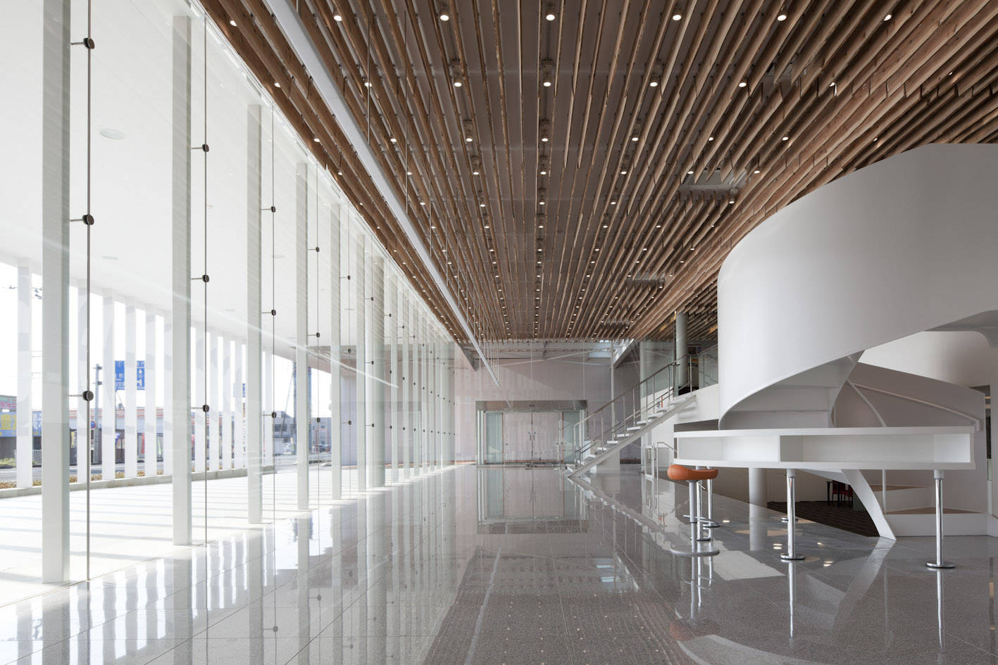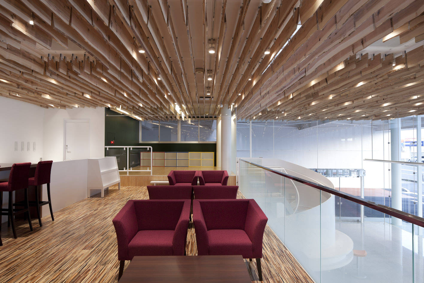建物の天井には、秋田杉を同じくルーバー状に吊り、インテリア全体が木質空間に包まれます。