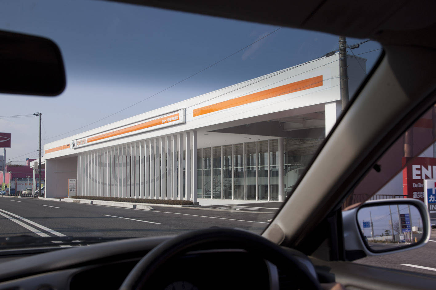 車のディーラーのほとんどは、石や金属を使ってシャープでハードな未来的なデザインが多いですね。