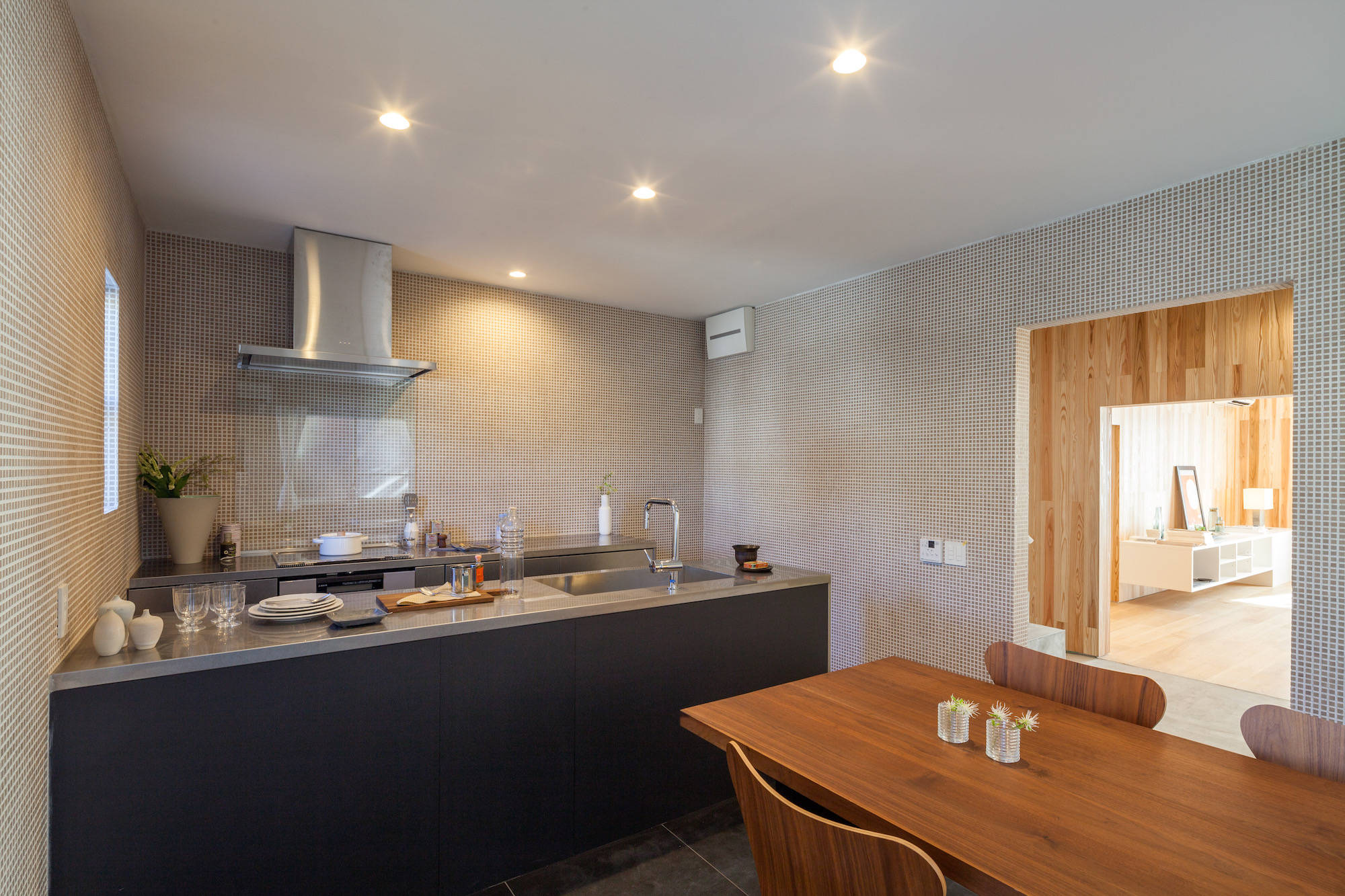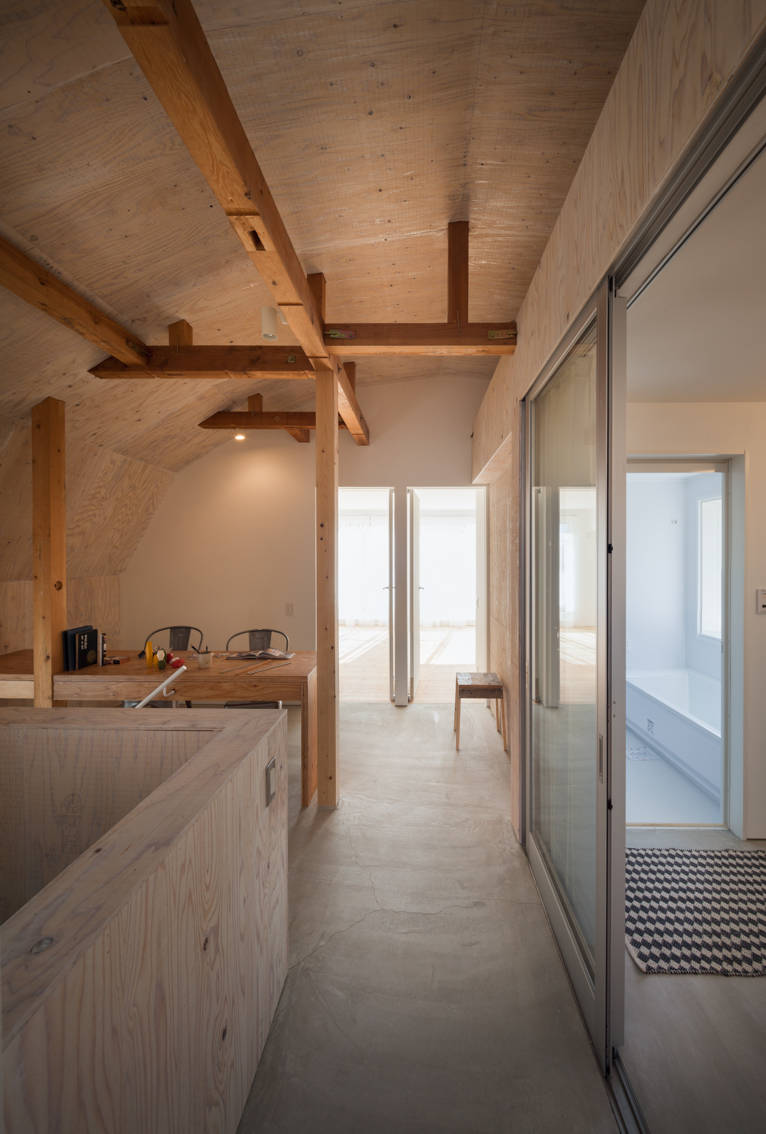 リビングは杉の箱、ダイニングキッチンはモザイクタイル、個室は白のEP塗装、ガレージルームは木毛セメント板・・・、そんな個性的な部屋たちをニュートラルで無機質なモルタルとベニヤの住戸の中に散りばめました。