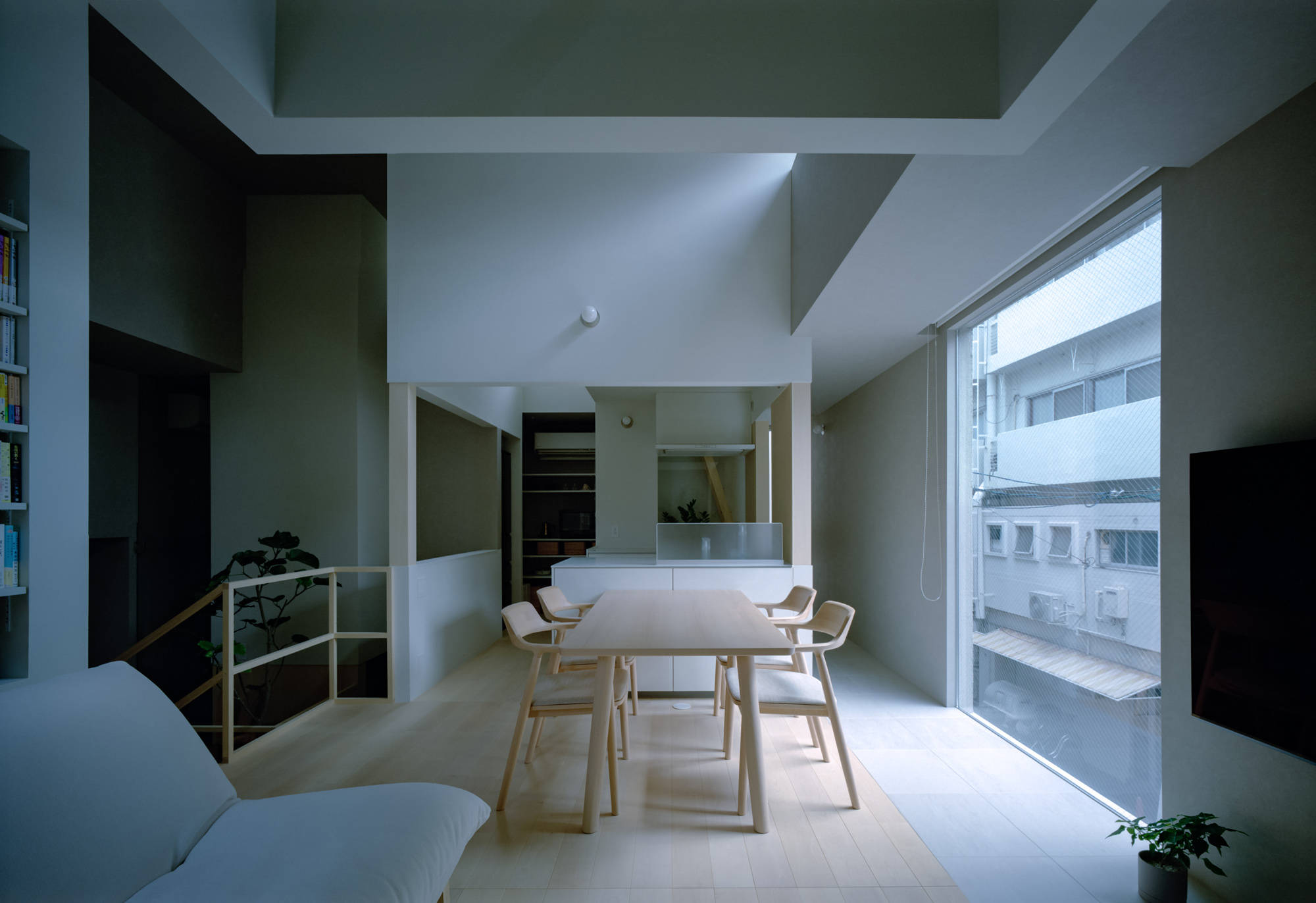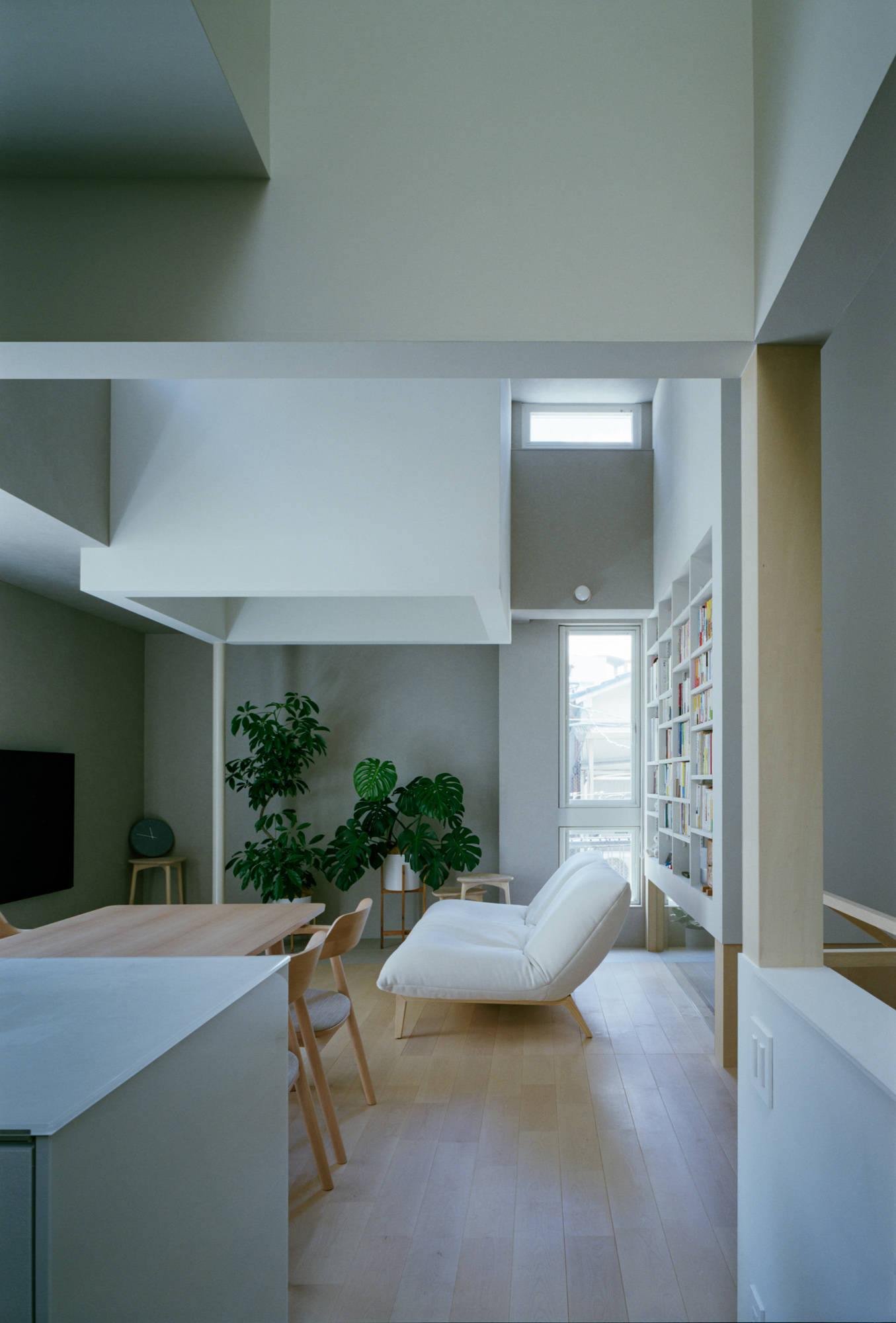 今回のデザインでは、4つのボリュームが2階まで伸びる吹き抜けを設けることで、開放感と奥行きのある空間を創出しました。それぞれのボリュームは適切な距離を保ちつつ配置されており、脱衣スペースなどの機能を持つ「路地」のような隙間が生まれます。これにより、横方向への視線の抜けも意識し、心地よい広がりを感じられるようにしました。