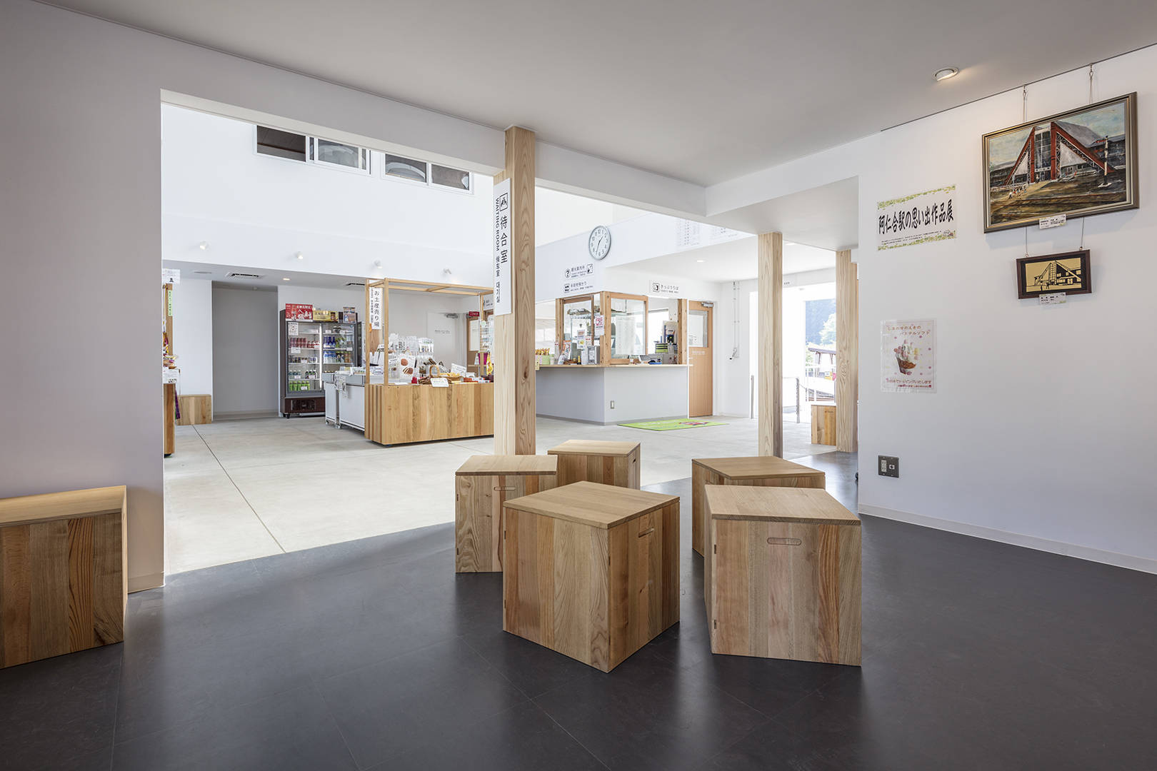 1階は1/3を地元のお土産を中心としたショップに、1/3は待合と交流スペース、残り1/3はギャラリーとこの地域でも人気の洋食レストランを計画した。客席から内陸線が見え、トレインビューカウンターを用意した。ここは地域の数少ない外食ができる場にもなっている。