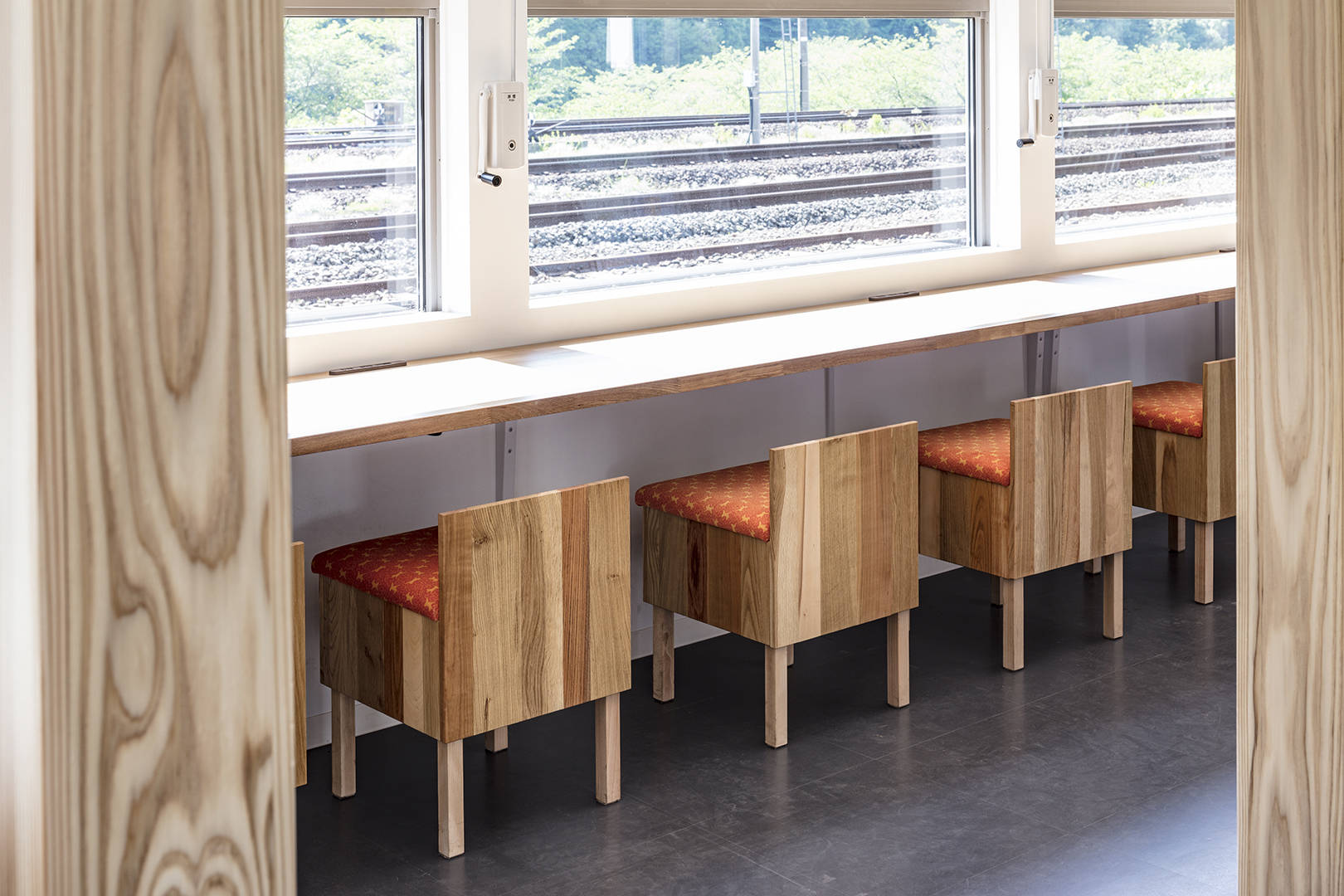 建築の基本的な性能(耐震・断熱)を現代に戻すことはもちろん、町の顔となっていた特徴的な三角の外観は残し、内部の2階の床を抜いて吹抜けを造り、駅舎内部でもそのシンボリックな三角屋根の気積を感じられる様にした。