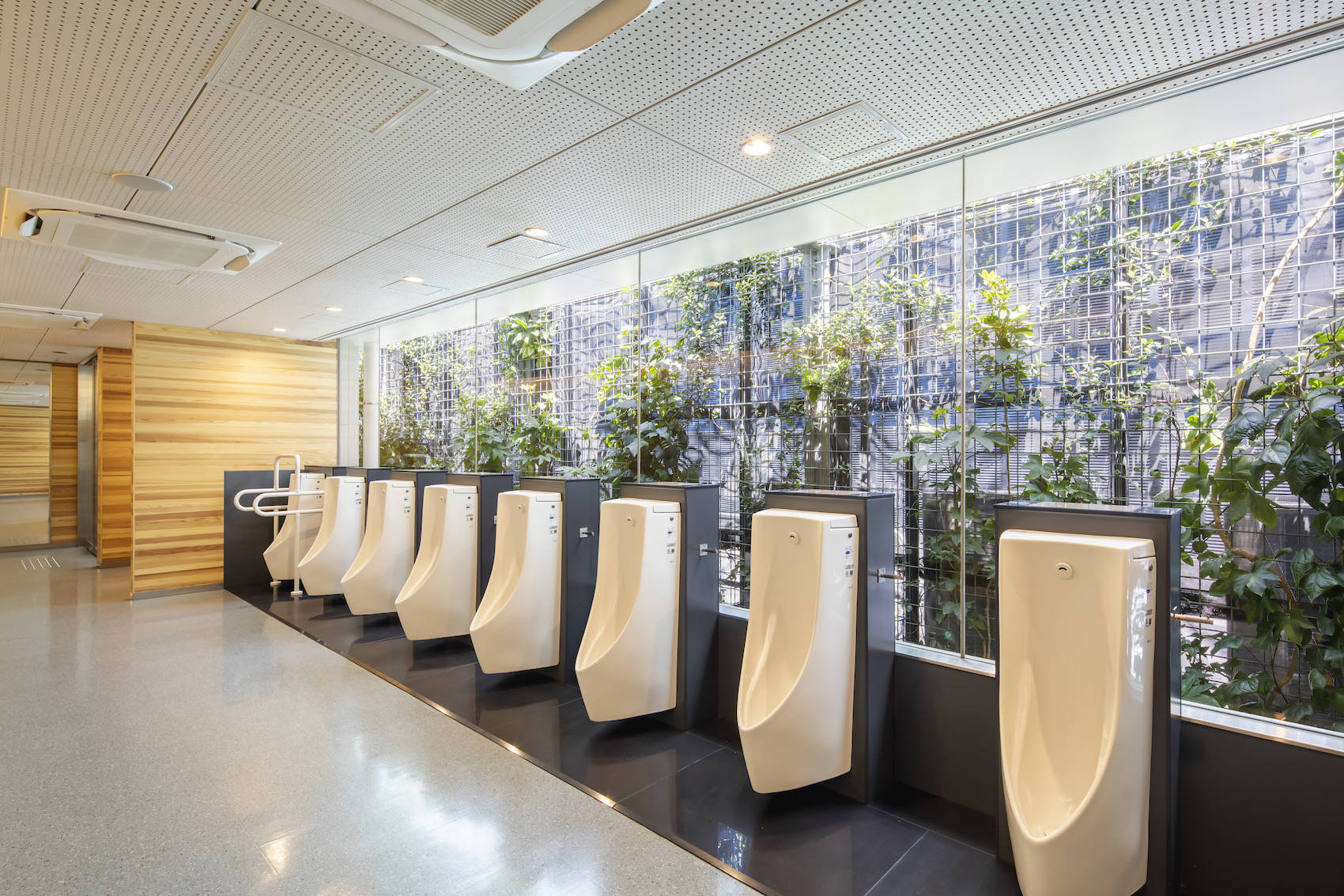 そこで我々は、既存の遮音壁に沿ってできるだけ駐車スぺースの中央付近にトイレスぺースを細長く配置して、駐車スペースのどこからでもトイレスペースに最短距離で安全にアクセスしやすいようにした。同様に休憩所は高速道路側に背を向け敷地東の緑地と繋がるように加速車線に沿ってパラレルに配置した。高速道路側には奥行き1mの備蓄倉庫を30m設置することで収納管理しやすく、万が一の時に使いやすい形状としたことはもちろん、加速車線が近い休憩所の遮音壁としても機能する。