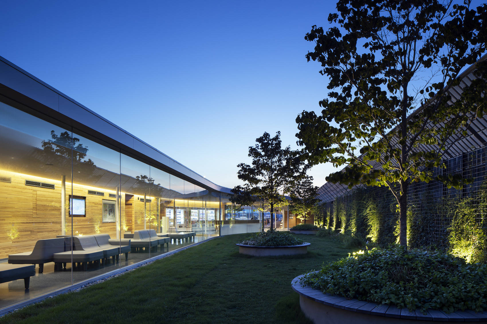 既存の遮音壁と遮音機能を備えた休憩所の間は、高速道路をずっとエンジンとタイヤのノイズを聞き続けてきたドライバーにとって静かにリラックスできる緑豊かで開放的な広場になっている。