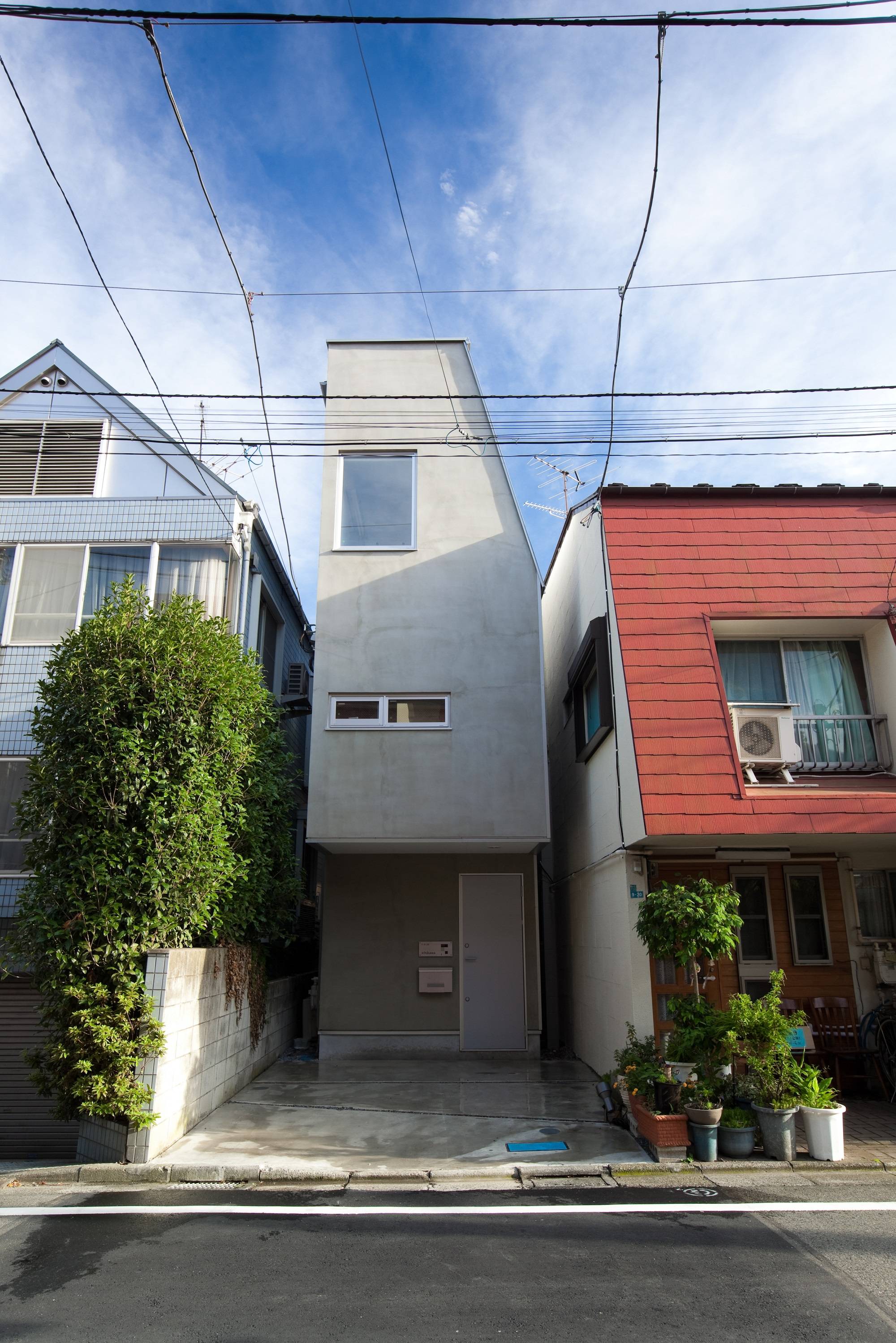 また、川の反対側にある遊歩道からの視線を緩和するために、ダイニングキッチンと川の緩衝領域としてパティオを設置。外壁を皮膜として、内部空間までの視線と感覚を制御している。また、外壁で囲まれた一部分を切り取ることで、額縁として川の景観を内部空間に取り入れるように計画している。