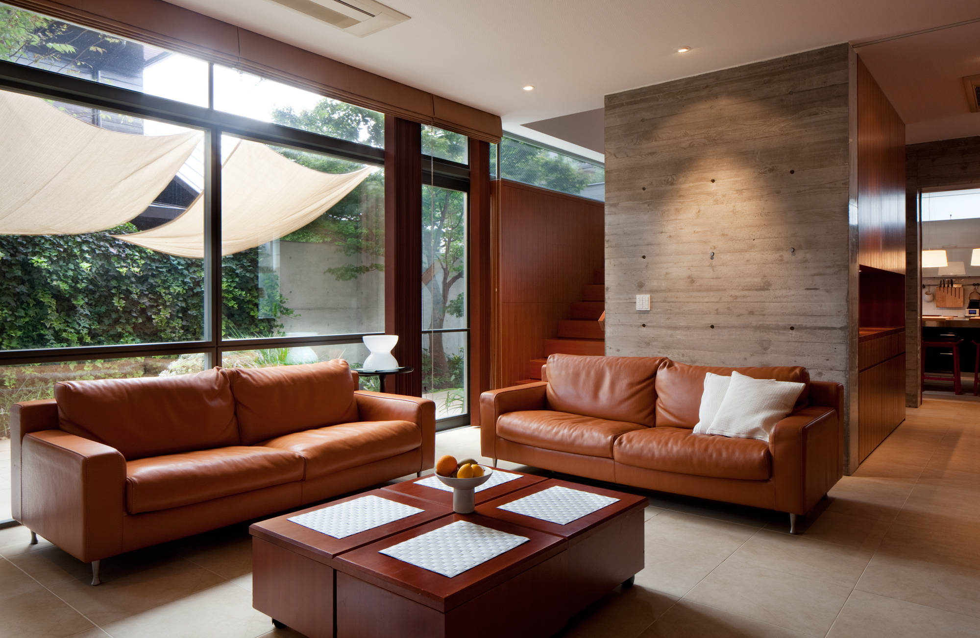 東京都、閑静な住宅地に計画したRC造2階建ての住宅。プライバシーの確保と開放性が求められた。そこで縦長のヴォリュームを敷地中央におき、南北両面に庭をとることで、 生活空間を緑豊かな緩衝空間で取り囲む配置とした。中央のヴォリュームはプログラムにあわせて4つのブロックに分節し、それらを少しだけずらしながら繋いでいる。これにより外部に表れるヴォリュームは程よく分節され、庭に変化がうまれる。また内部には視線や風の抜け道が生まれるとともに、空間に適度なたまりができた。エントランス・リビング・ダイニング・キッチン、各部屋からはそれぞれの空間の特性に合わせた庭を楽しむことができる。重厚感ある本実のRC壁・豊かな緑に囲われ、外との繋がりをもちながらも落ち着きのある住宅となった。