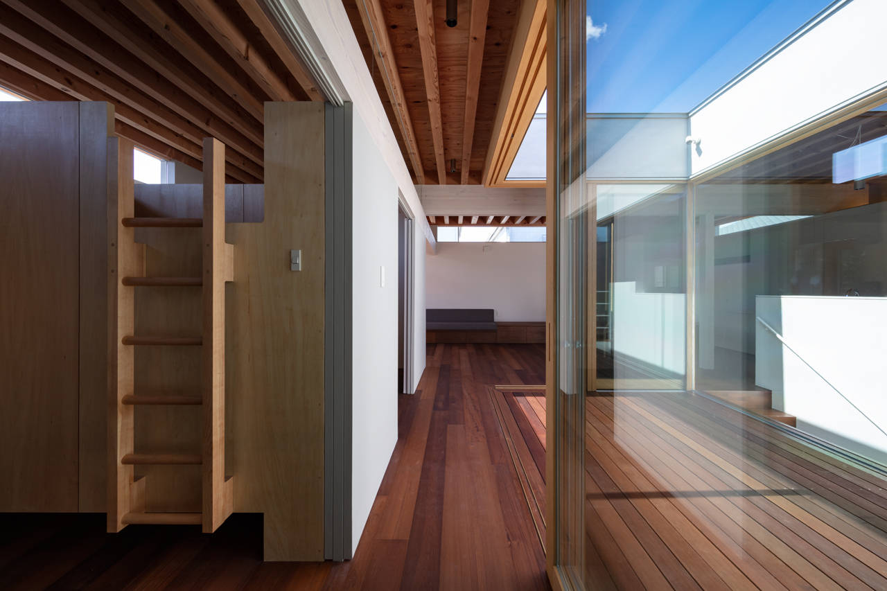 木造部分は中庭型のロの字プラン。周辺を住宅に取り囲まれているため、四方からはハイサイド窓からの光と風を取り入れ、中(上空)に向けて大きく開くプランとした。