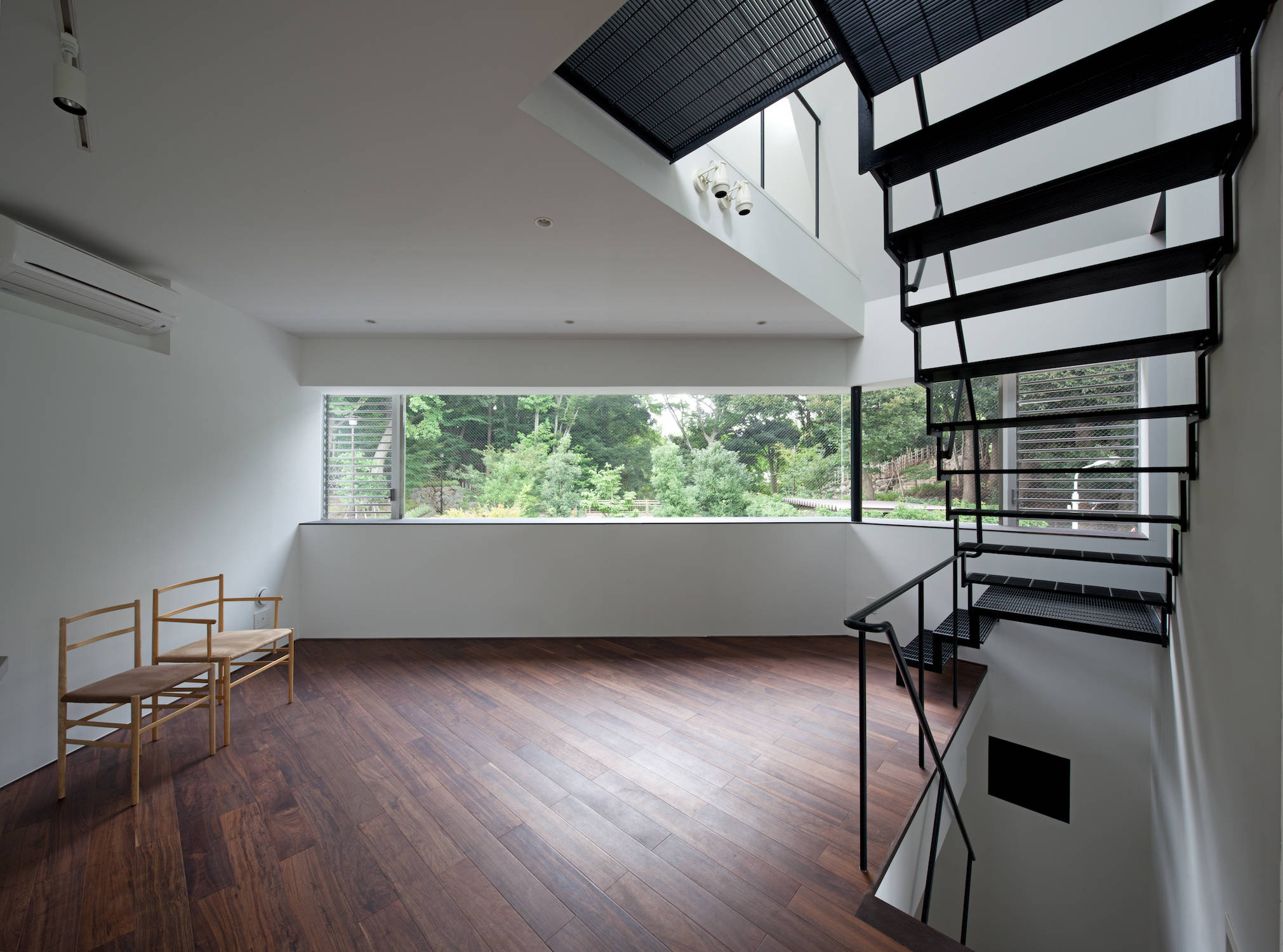 51平米の五角形の変形敷地の中に、駐車場や中庭の外部空間を設けました。この外部空間と公園に対して、色々な形の窓を開け、様々な方向に視界が広がる開放的な住宅を作りました。