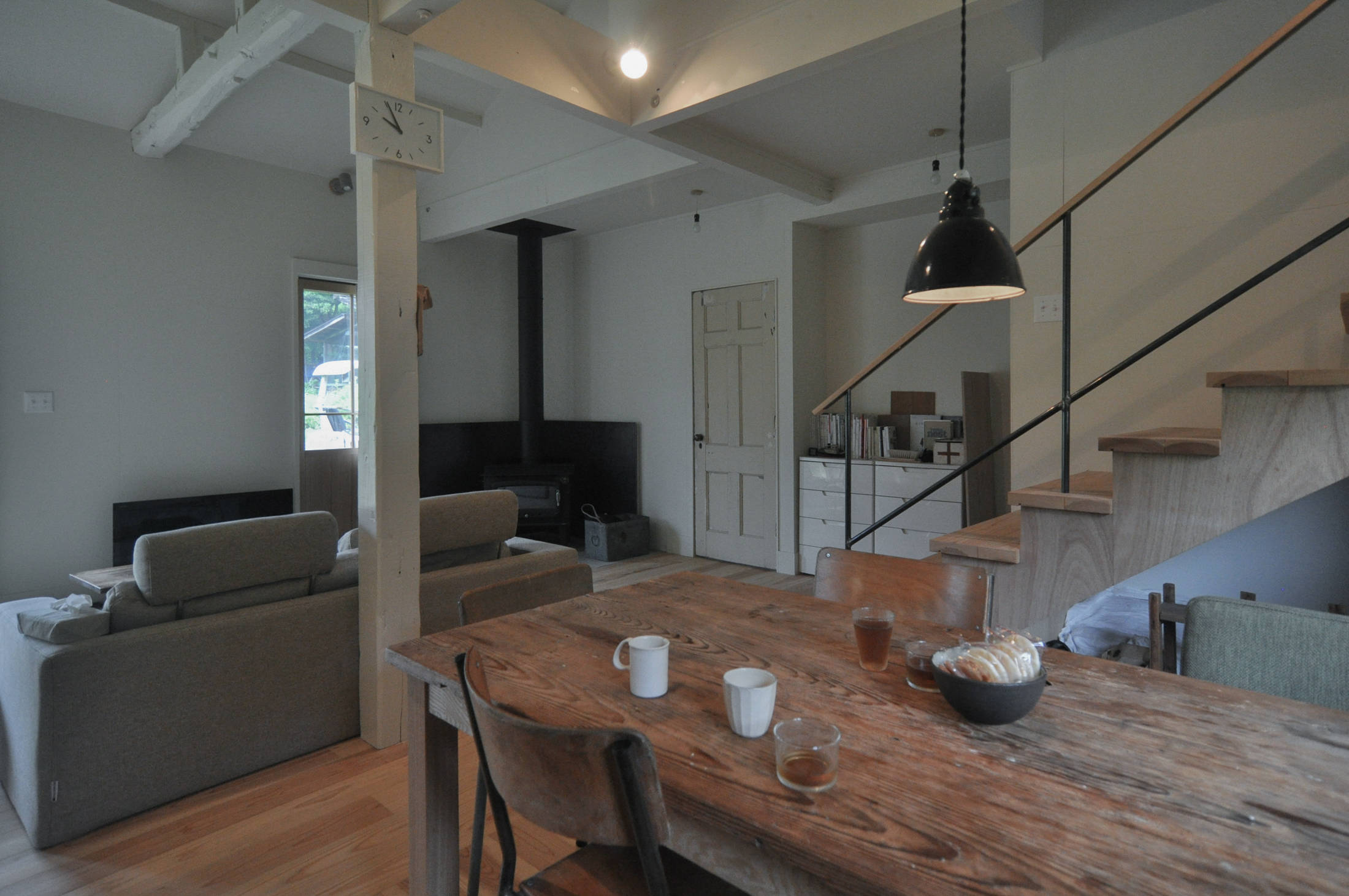 飯能市西吾野の高麗川沿いに建つ住宅です。山並みや高麗川を借景にしたローカルサイドの暮らし。お客さんから支給された中古の柱、梁材、アンティーク建具や照明を中心に、ペンキ仕上げの壁と杉板の無垢フローリングで仕上げたシンプルな住宅です。(埼玉県飯能市 Y邸)