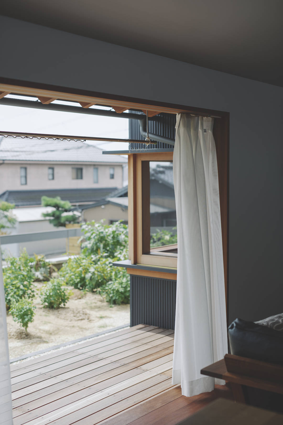 もともと週末に家庭菜園を楽しまれていたこともあり、引き続き家庭菜園を楽しむスペースのある庭を希望されていたので、リビングと庭を緩やかに繋ぐためウッドデッキと深い軒を設けた。