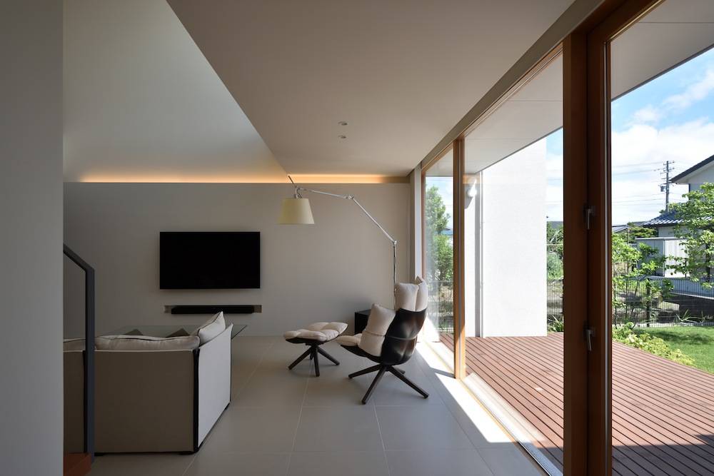 プランはザックリと敷地を三分割し道路から一番手前はガレージと玄関に、真ん中のゾーンは道路面から塀で囲った中庭にして一番奥のところにロフトのあるLDKを配置するという簡潔(シンプル)な構成です。 ロフトと繋がった吹抜のあるLDKは上下方向に適度な開放感があり、 さらに北庭と南庭にも面しているので水平方向にも視線が抜けて風も通り抜ける。そんな気持ちの良いLDKはこの家の存在の中心となりました。
