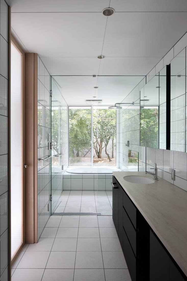 ダイナミックな5Mの大壁により、近隣住宅からの視線のシャットアウトし、そこに庭園を配置した。