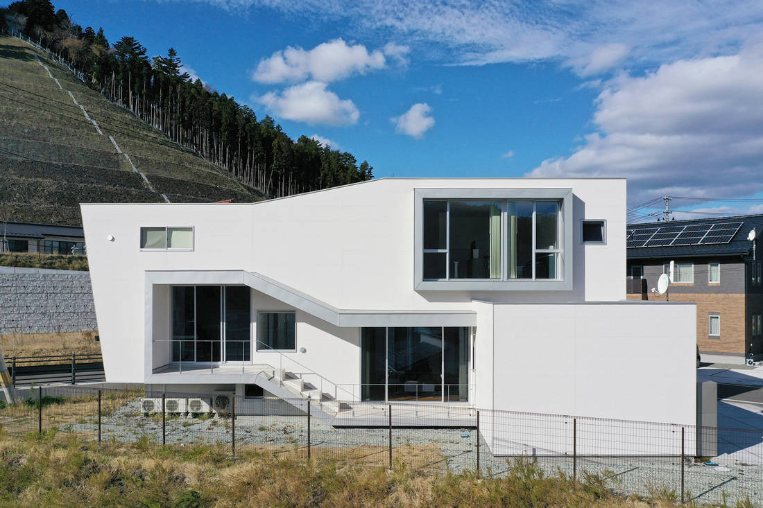 リビングスペースは1.5層の吹き抜け空間をスチールロッドの吊構造として開放性を演出し、その上部をルーフバルコニーとし、近隣のスラブレベルよりも高いため視覚的バッティングがなく、空をつかめるようなプライベートな外部空間を生み出しました。