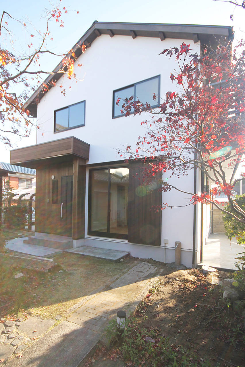 外観は母屋に合わせて漆喰塗りと木の落ち着いた雰囲気となっている。