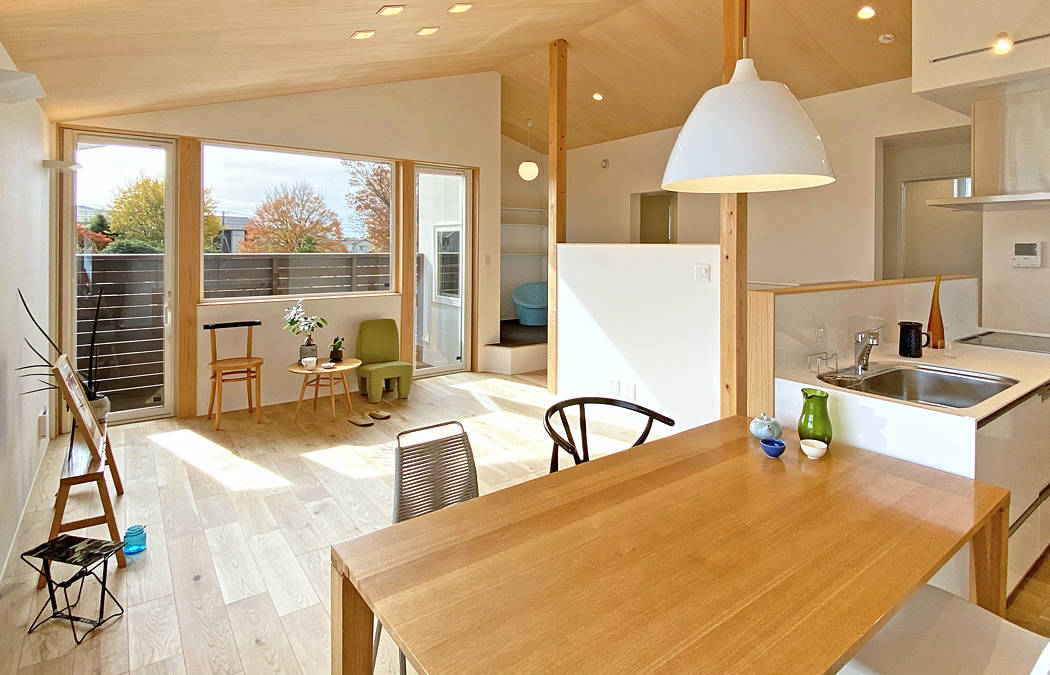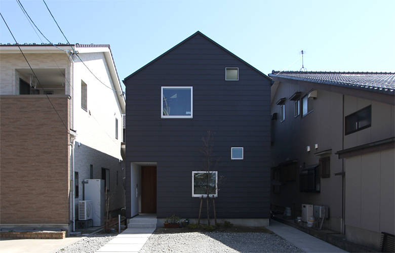 北西の角地に建つ住宅の建て替えです。東と南には大きな住宅が建つ状況で、明るさと開放感を確保するため、リビングスペースと子供室をあえて道路に面した 北に配置しています。その上で、南の空地に庭を配し、大きな開口部を設けました。シンプルなふたつの切妻屋根のひとつは、1階にリビング、2階にはタタミのセカンドリビングがあり、 どちらも眺めの良い南庭に開いています。