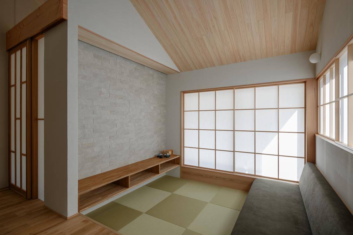 敷地条件から敷地の東側に建物を寄せ、あえて西側にあたる奥に駐車スペースを設けることで、広いプライベートな広場を確保しました。日中、光が入りづらい敷地条件を考慮し平屋部分を生かした天窓を設け、内部の色調は白色を基調とした左官や羽目板に限定し、窓辺には光を反射させる障子を設けることで、少量の光でも空間が明るくなる工夫を行いました。