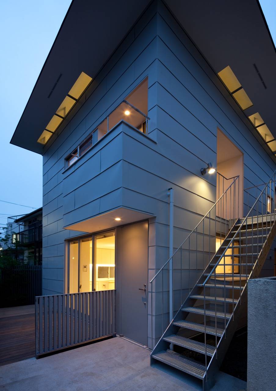 都心の密集市街地に計画した木造の2世帯住宅。既存の2階建て住宅は、敷地一杯に建っていたため、玄関まで暗くて狭い隙間を通ってアプローチしなければならず、また光の届きにくい暗い部屋もいくつかあった。建て替えに際しては、平面をコンパクトにまとめ3階建てとし、隣地からできるだけ"引き"(1.2M~1.8M)がとれるように計画した。