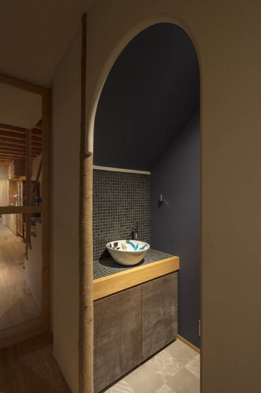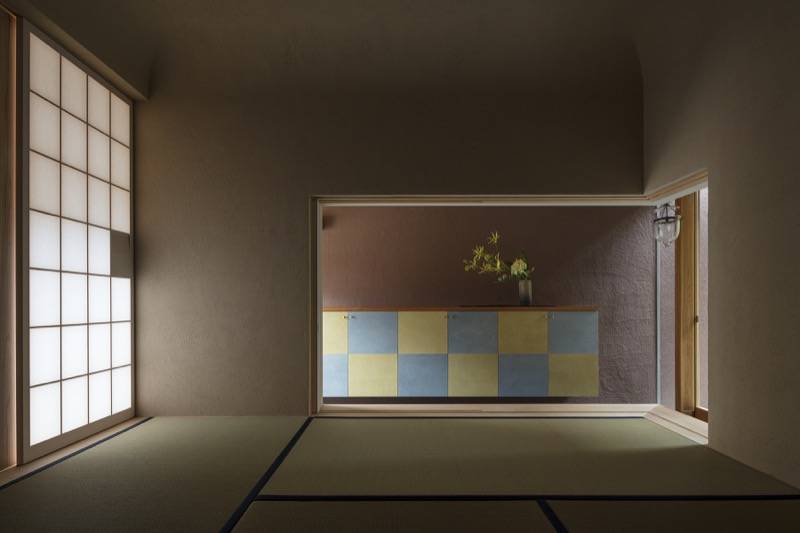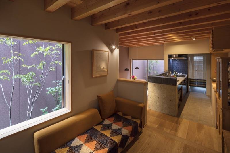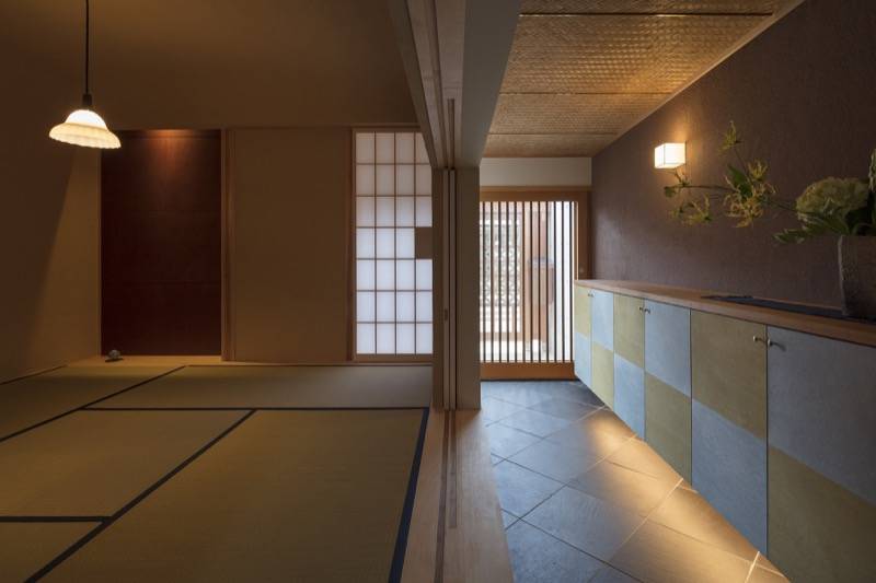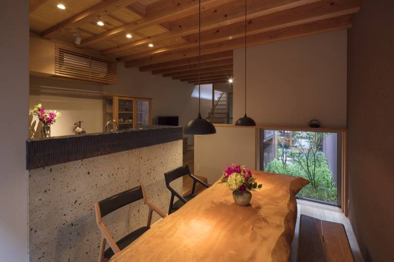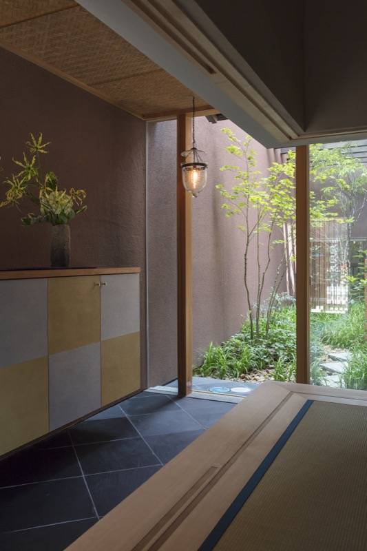 通りに面するステンレス製の格子、通り庭、坪庭、そして奥庭に進むにつれ視線が制御され、異なる場をもつ京町家形式の住まいです。坪庭と連続する開放的な通り庭とは対照的に、そのすぐ隣には洞窟のような和室を設え、応接室や客間、ギャラリーなど多目的な用途に対応できるように計画しました。また坪庭の奥にある居間と食堂は、玄関とは視線が交差しないように窓を計画することで、より親密な空間を実現しています。